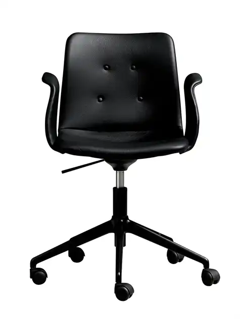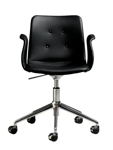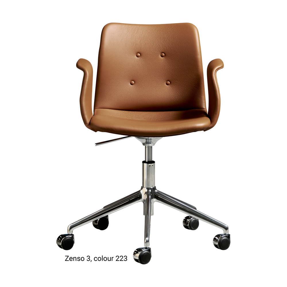 Det femstjernede drejeunderstel i poleret eller sortlakeret aluminium sikrer både stabilitet og bevægelsesfrihed. Stolen har justerbar siddehøjde og er udstyret med hjul, hvilket gør den ideel til både hjemmekontoret og det professionelle arbejdsmiljø.