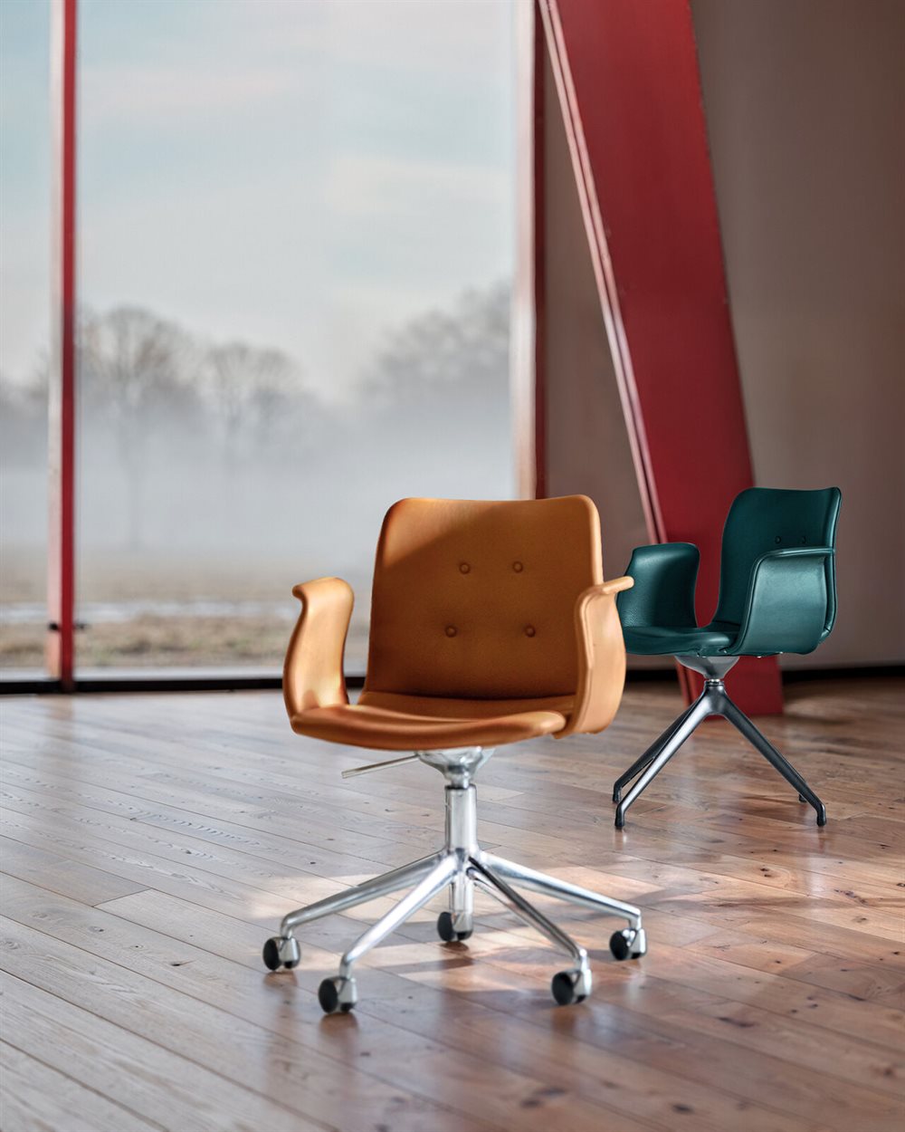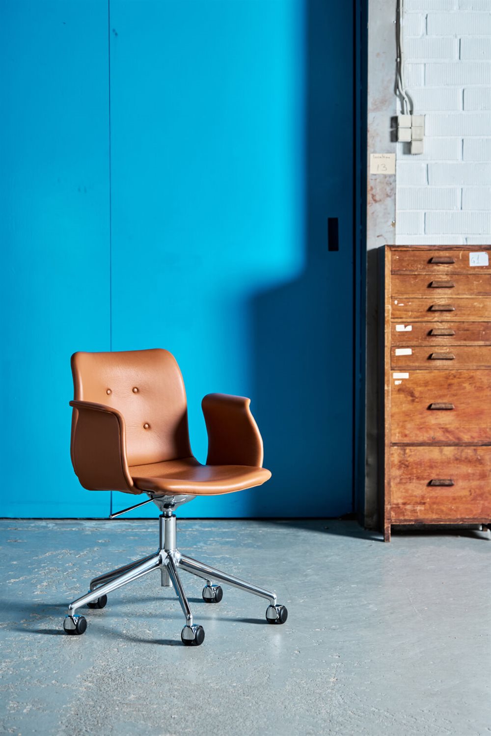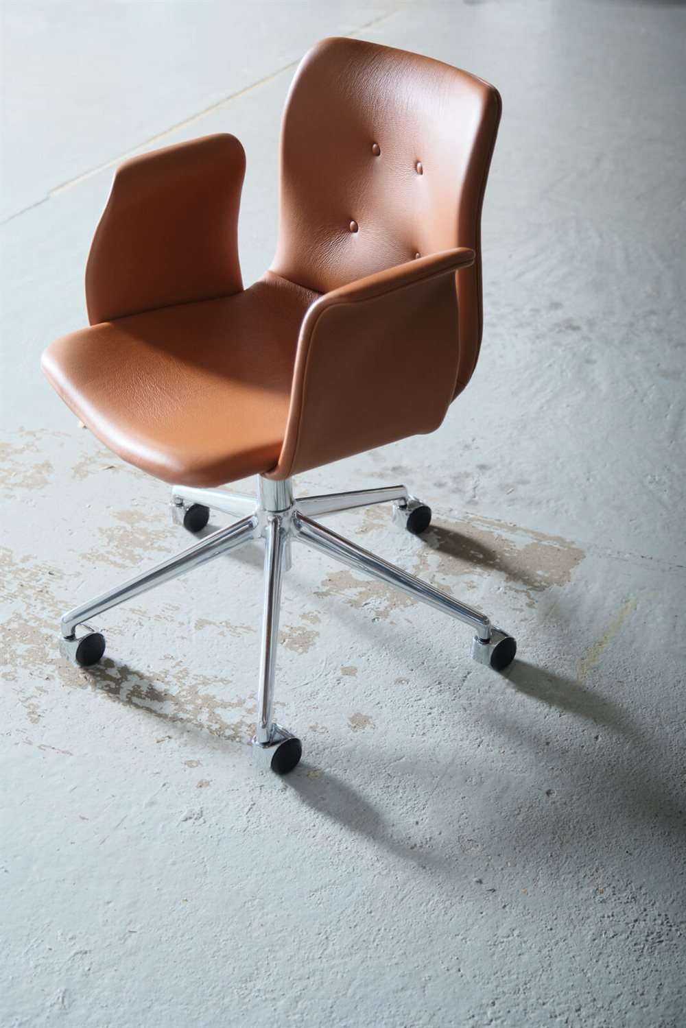 Den karakteristiske ryg bøjer sig let og tilpasser sig brugerens rygsøjle, hvilket giver optimal støtte gennem hele arbejdsdagen. Sæde og ryg er polstret med formstøbt koldskum og betrukket med eksklusive tekstiler eller læder.