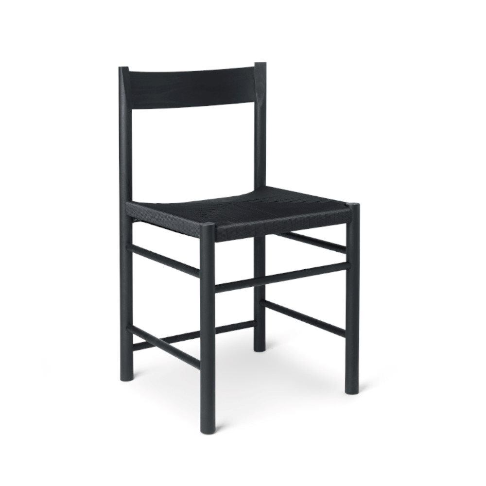 F-stolen fås i bøg og eg med sæde flettet i slidstærkt polyester.