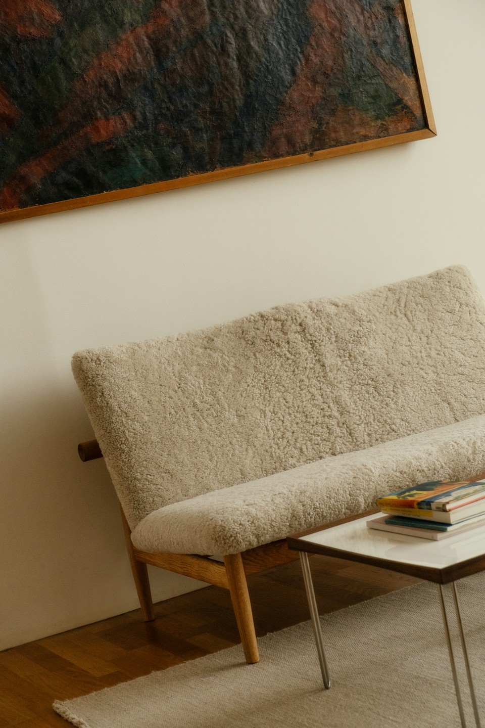 Sofaen er kendetegnet ved sine organiske, bløde former og det karakteristiske design, som Finn Juhl skabte i 1950’erne — et formsprog, der stadig fremstår moderne og tidløst. Kombinationen af træets varme udtryk og det naturlige fårskind giver sofaen både lethed, komfort og en stærk visuel tilstedeværelse i rummet.