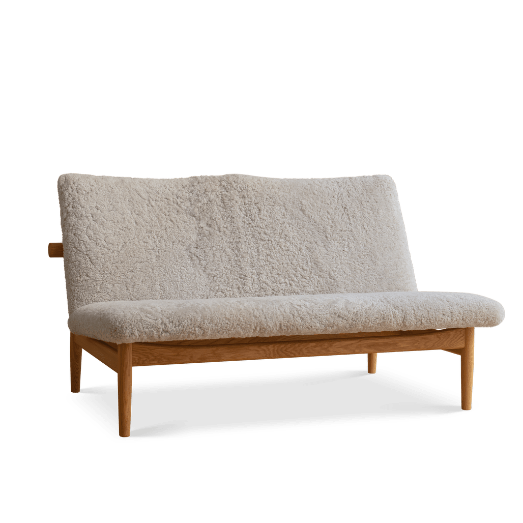 Japan Sofa 2-pers. fra Finn Juhl er et ikonisk møbel, hvor dansk designarv og skulpturel elegance mødes i en smuk og indbydende loungesofa. Denne model er udført med stel i eg med oliebehandling og betrukket med hvidt fårskind fra Skandilock, som tilsammen skaber et eksklusivt og komfortabelt udtryk.