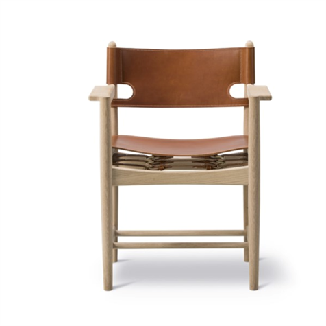 Den Spanske Spisebordsstol er designet af Børge Mogensen og er indbegrebet af kvalitetsmaterialer. Denne model har armlæn og er fremstillet af det fineste egetræ og sadellæder af højeste kvalitet.