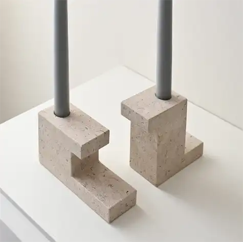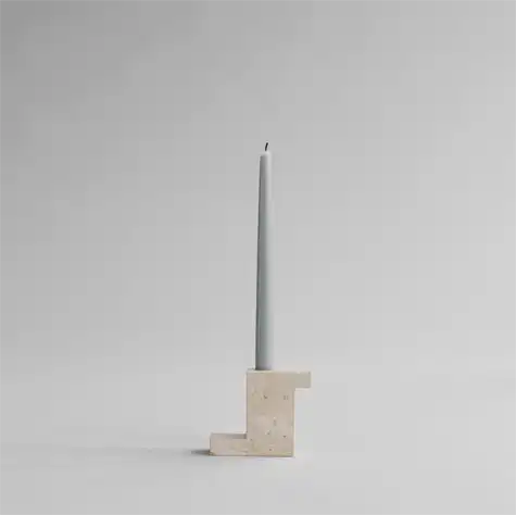 Inspireret af arkitektoniske bygningskomponenter er Brick Candle Holden lavet af udsøgt massiv kalksten fra Egypten, elegant udskåret i skarpe geometriske former. Hver lysestage er helt unik og understreger de rige og smukke mønstre af natursten. Den polerede overflade reflekterer blidt lyset fra stearinlyset og tilføjer en varme til Brick Candle Holderne. Mursten kommer i to former og størrelser, der komplementerer hinanden i en arkitektonisk komposition eller står alene som et skulpturelt objekt.