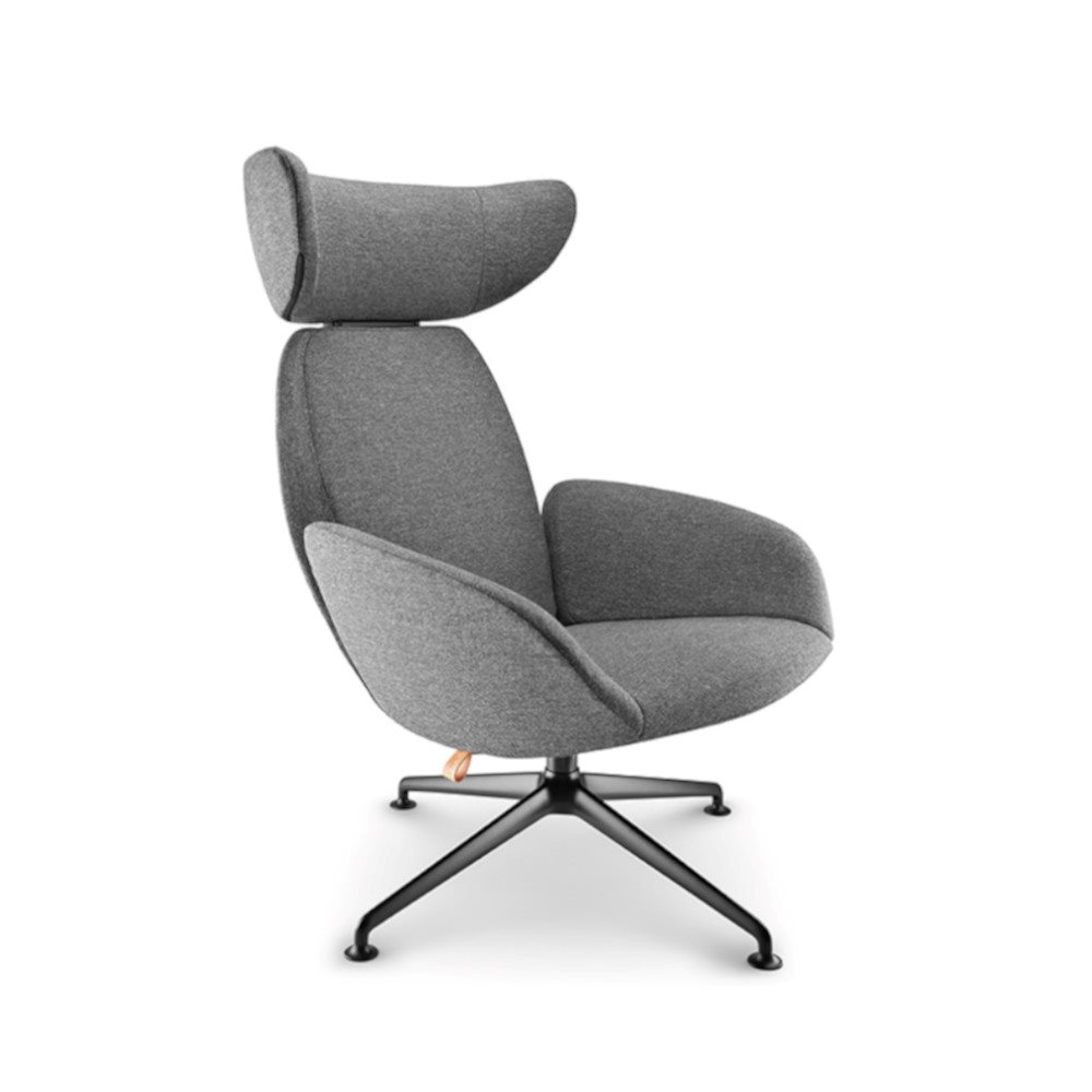 Lænestolen forener funktionalitet med komfort i et flot, skarpt design. I Laze kan du trinløs læne dig tilbage via diskret læderstrop i siden af stolen. På den måde kan du læne dig trinløst tilbage til den position, du ønsker.