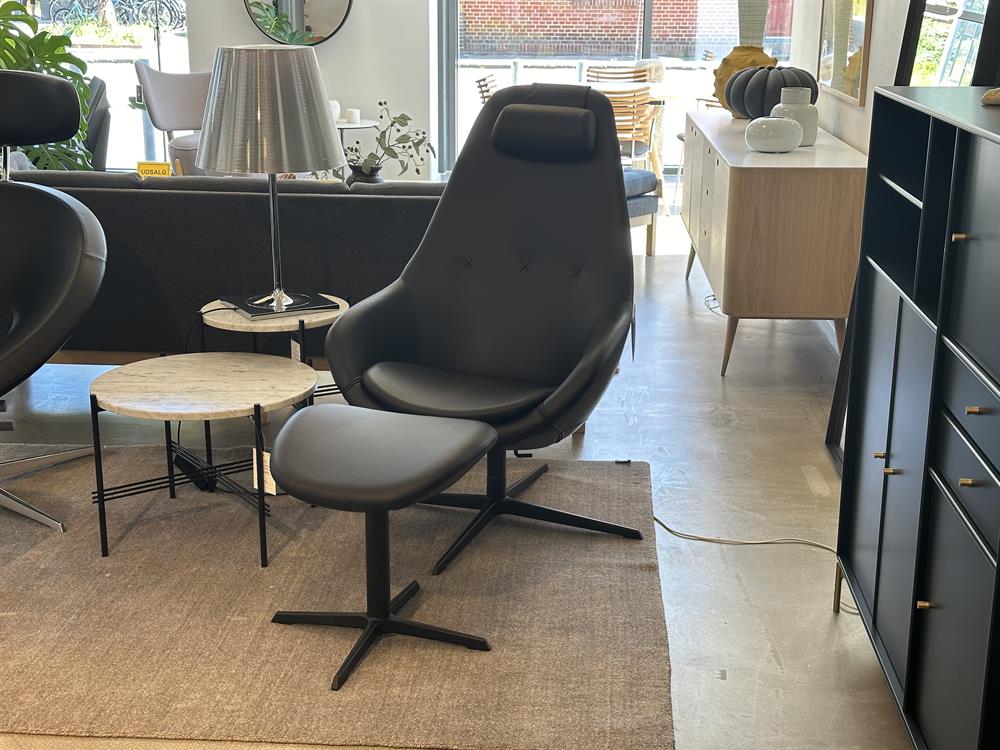 Kokon lænestol er designet til at omfavne kroppen og give maksimal komfort. Både stolen og skamlen er betrukket med sort læder af høj kvalitet, der giver et sofistikeret og elegant udseende, som passer ind i enhver moderne indretning.