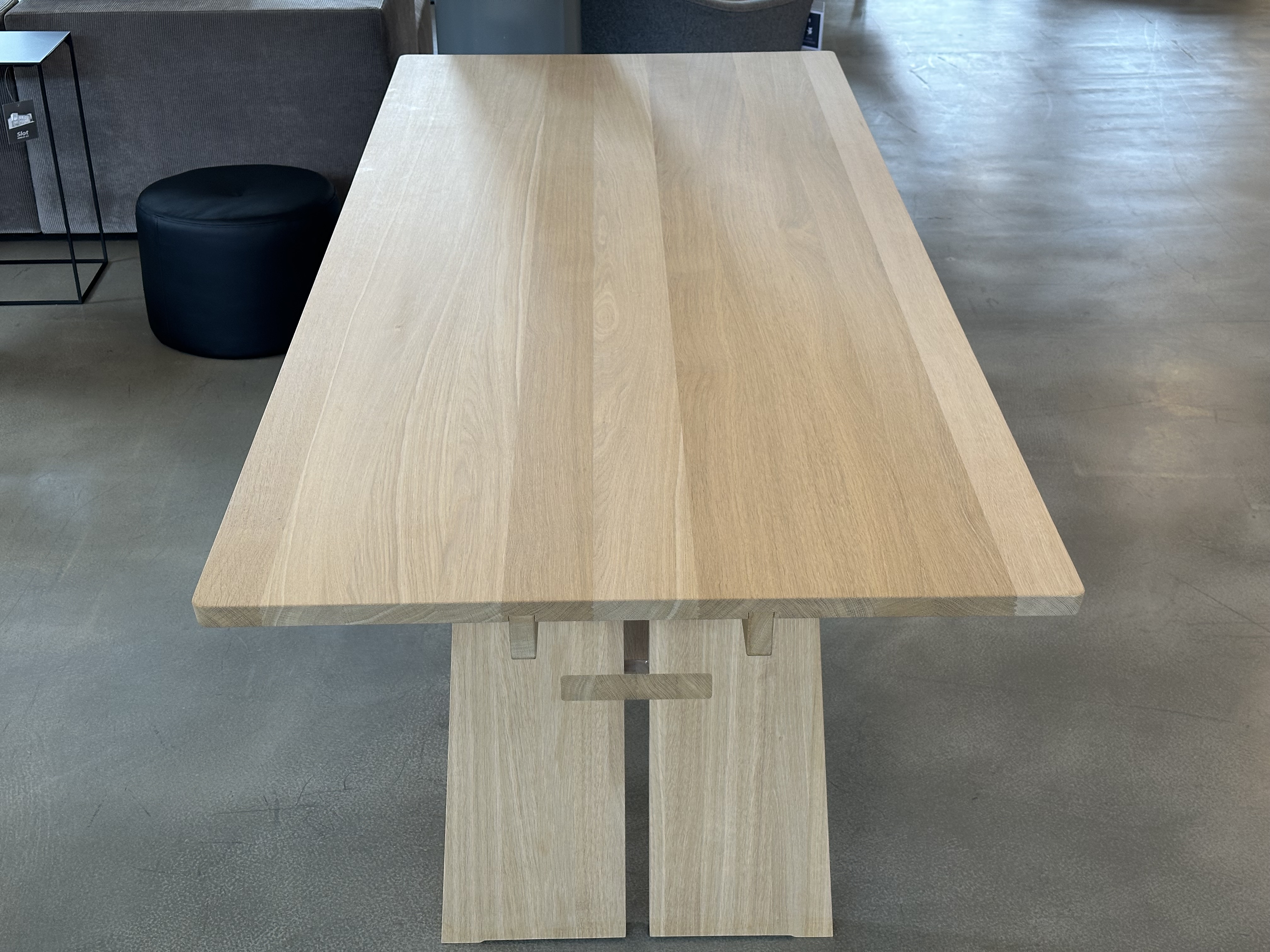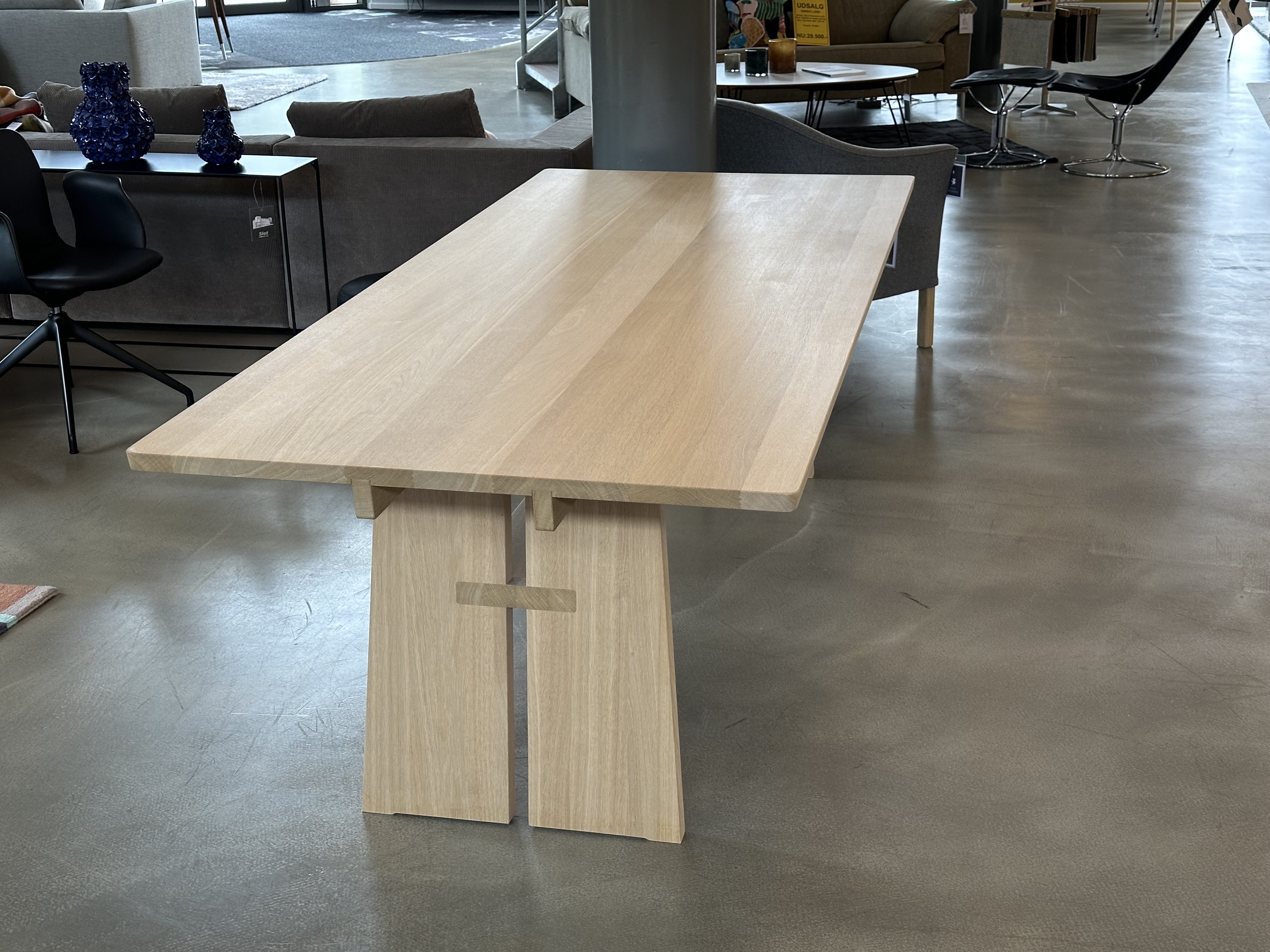 Bordet er udført i massivt egetræ behandlet med sæbe, som fremhæver træets naturlige struktur og giver en lys, nordisk finish. De blødt afrundede hjørner og den faset skårne kant tilfører en lethed og forfiner det stringente udtryk.