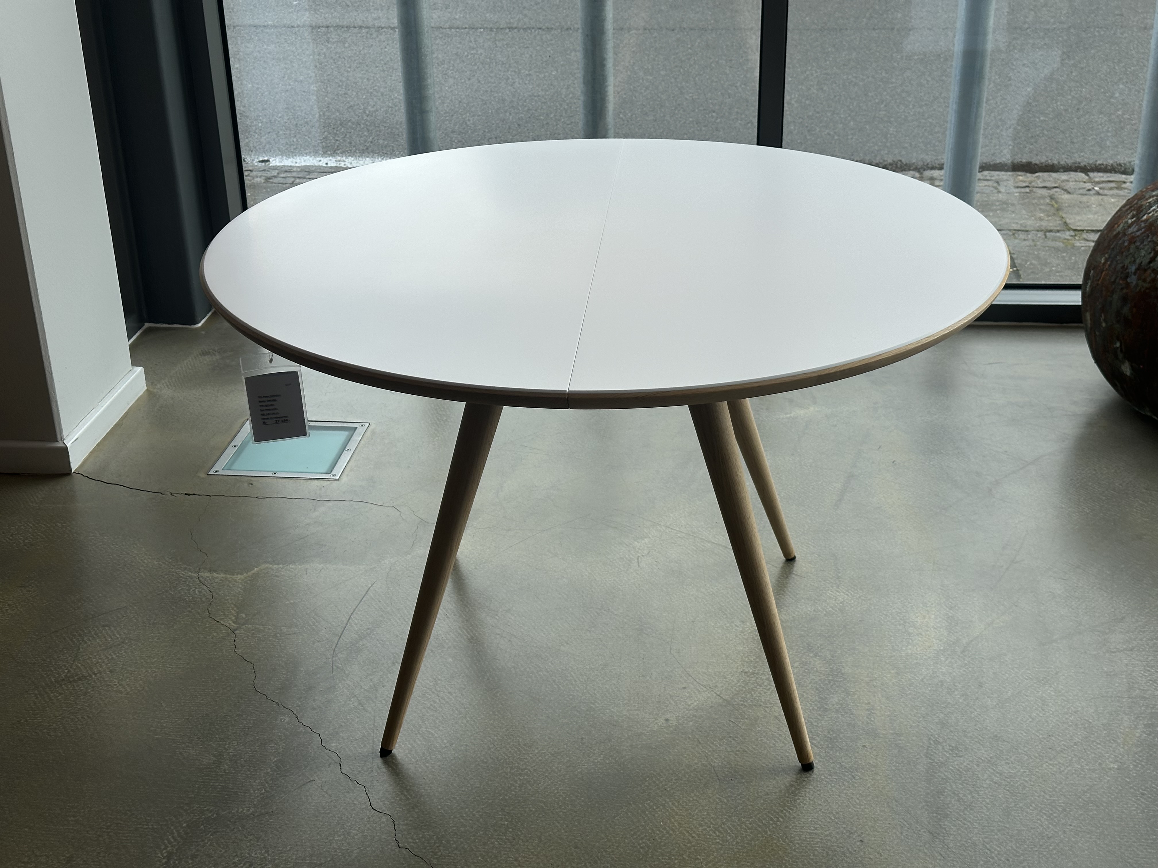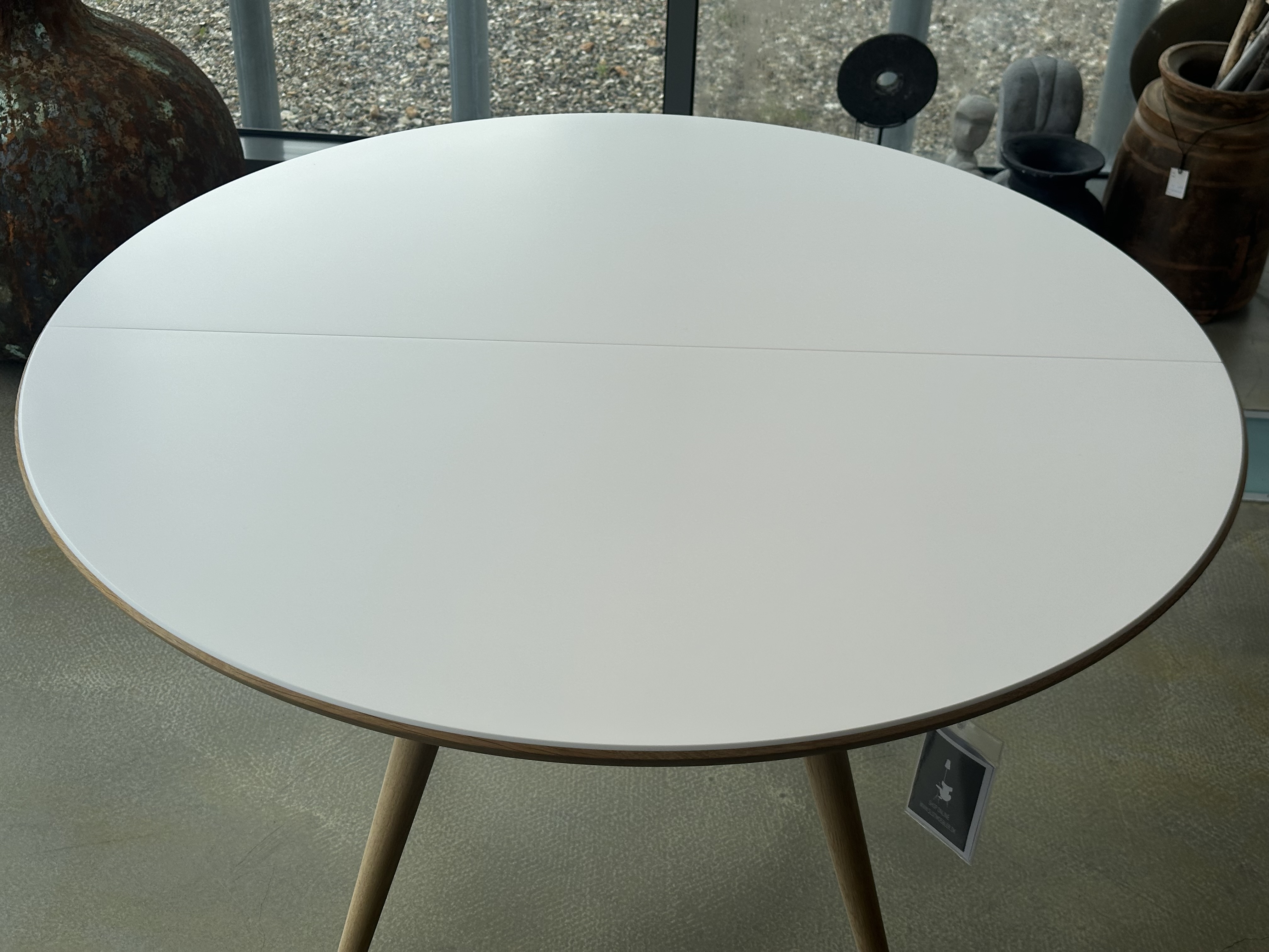 Det runde design gør bordet ideelt til samtale og samvær, mens det indbyggede udtrækssystem giver mulighed for ekstra plads ved behov. (OBS: Leveres uden tillægsplader)