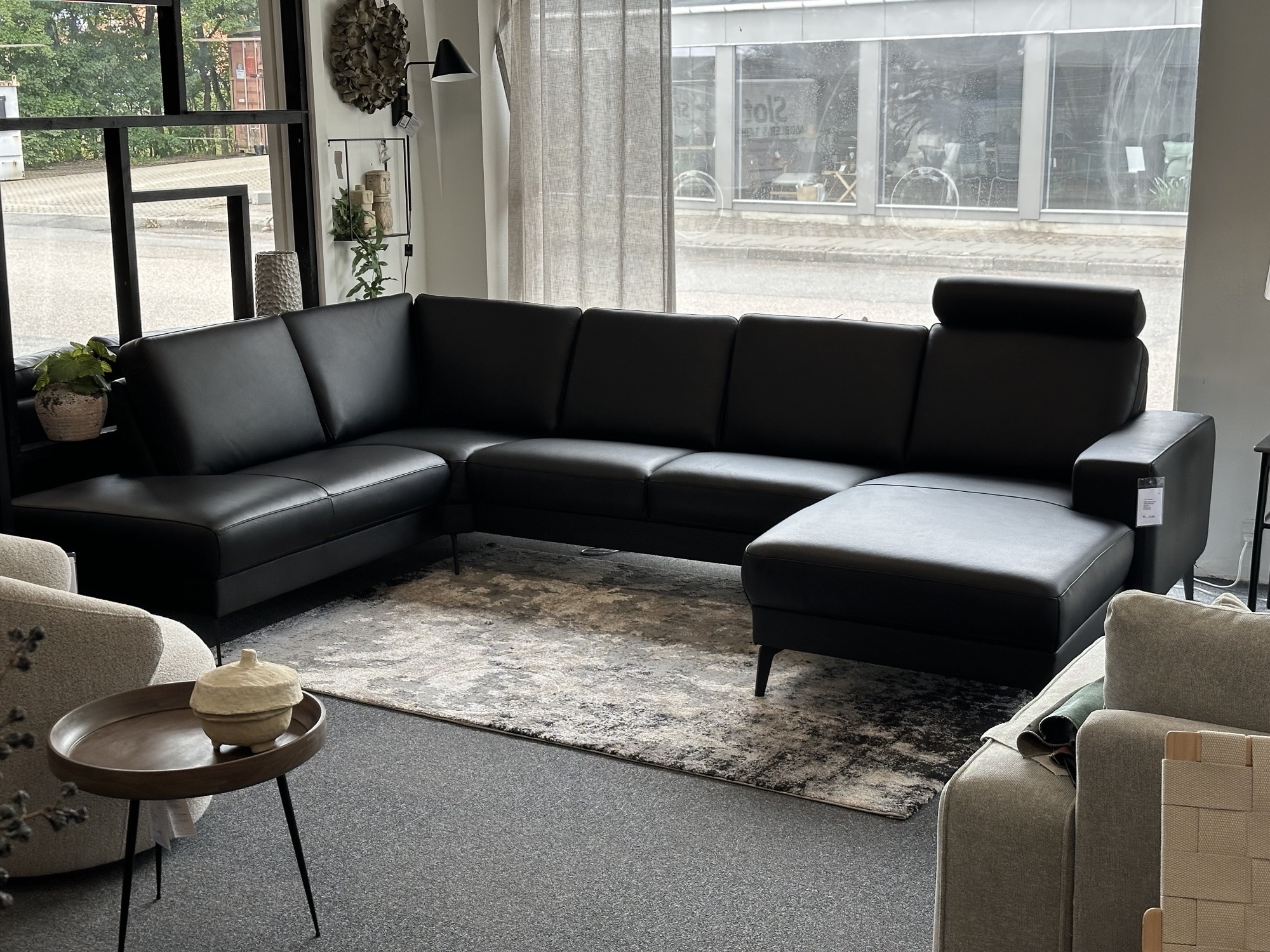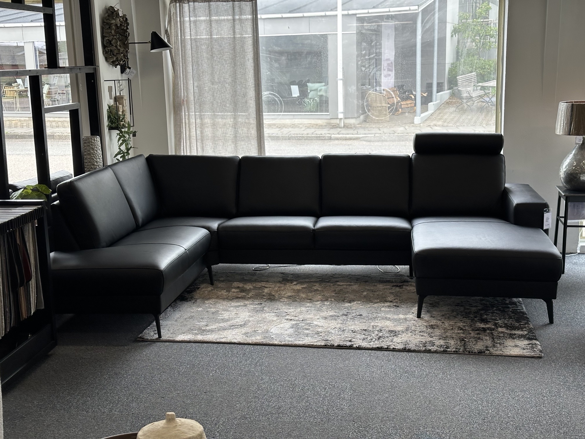 Choice 2642 er en moderne U-sofa med chaiselong og open end, der kombinerer komfort og funktionalitet i et elegant formsprog. Sofaen er betrukket med kraftigt sort Soleda/spaltlæder og har et indbydende udtryk, der passer ind i mange hjem.