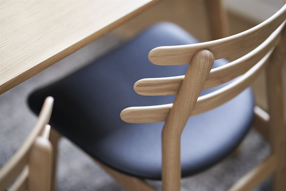 Poul M. Volther har skabt en stol med rene linjer og lune detaljer, som du mærker med det samme, når du sætter dig. Selvom stolen er slank, får du overraskende god rygstøtte, der gør lange middage og hverdagens stunder endnu mere behagelige.