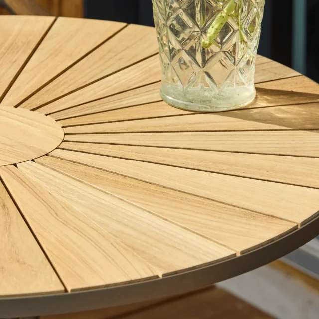 Bordet er fremstillet med bordplade i massivt plantageteak og stel i pulverlakeret aluminium. Teaktræet tilfører varme og naturlig karakter, mens aluminiumstellet giver stabilitet og høj holdbarhed.