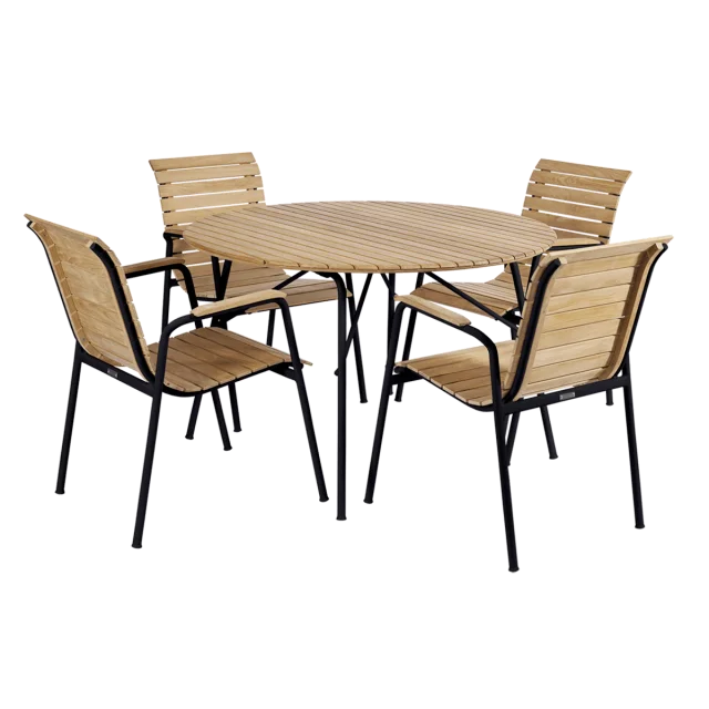 Havesættet består af et Magnolia havebord og Bellevue havestole, som tilsammen udgør et harmonisk spiseområde. Bordet har en bordplade i bæredygtig plantageteak, som tilfører varme og naturlig karakter, mens stellet i pulverlakeret aluminium sikrer høj stabilitet og lang holdbarhed. Kombinationen af træ og metal giver et tidløst udtryk, der passer ind i både klassiske og moderne udeområder.