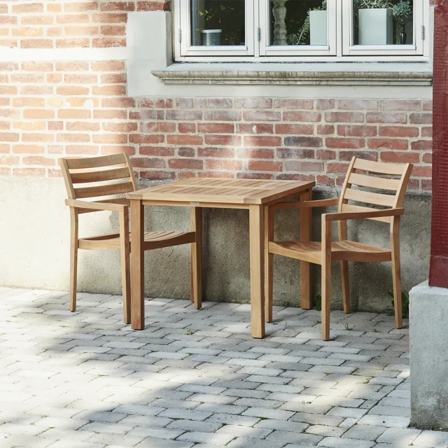 Havesættet består af et Cambridge havebord og York havestole – begge udført i teaktræ af høj kvalitet. Teak er kendt for sin naturlige holdbarhed og evne til at modstå nordisk vejr, hvilket gør dette sæt ideelt til udendørs brug uden behov for hyppig vedligeholdelse. Teaktræets varme toner og levende struktur giver et klassisk og organisk udtryk, der passer til mange typer udeindretning.
