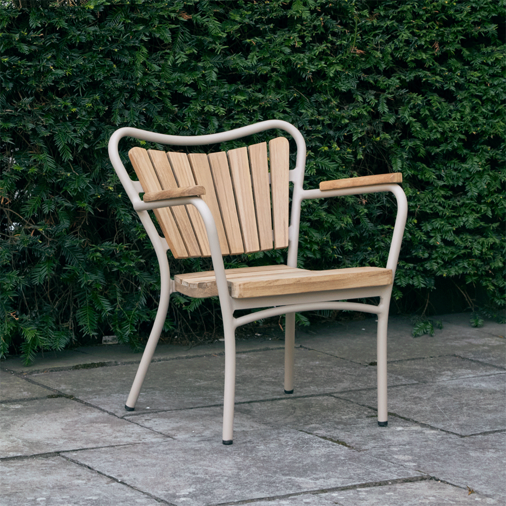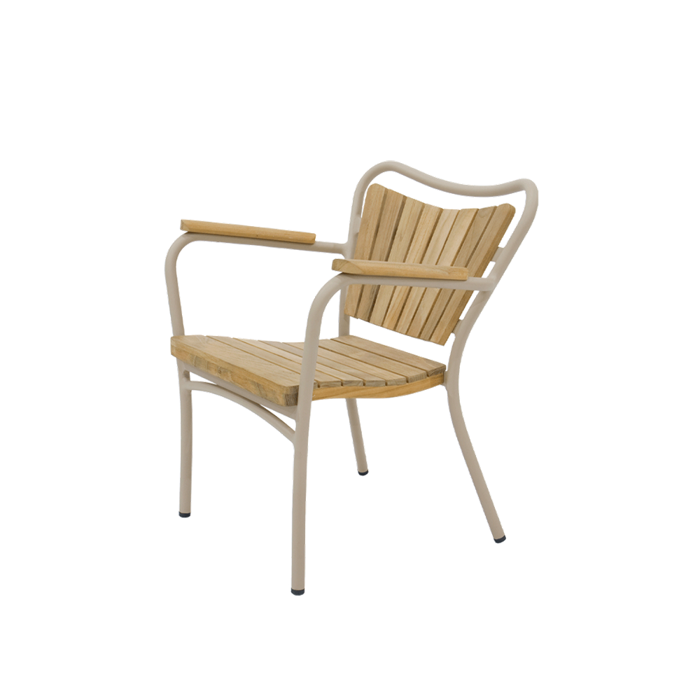 Marguerit Kids er en stabelbar letvægts havestol til børn i Marguerit havemøbel-serien. Sæde, ryg og armlæn i teak og stel i aluminium.