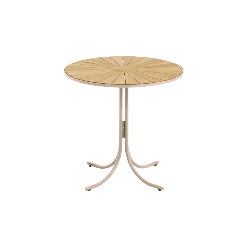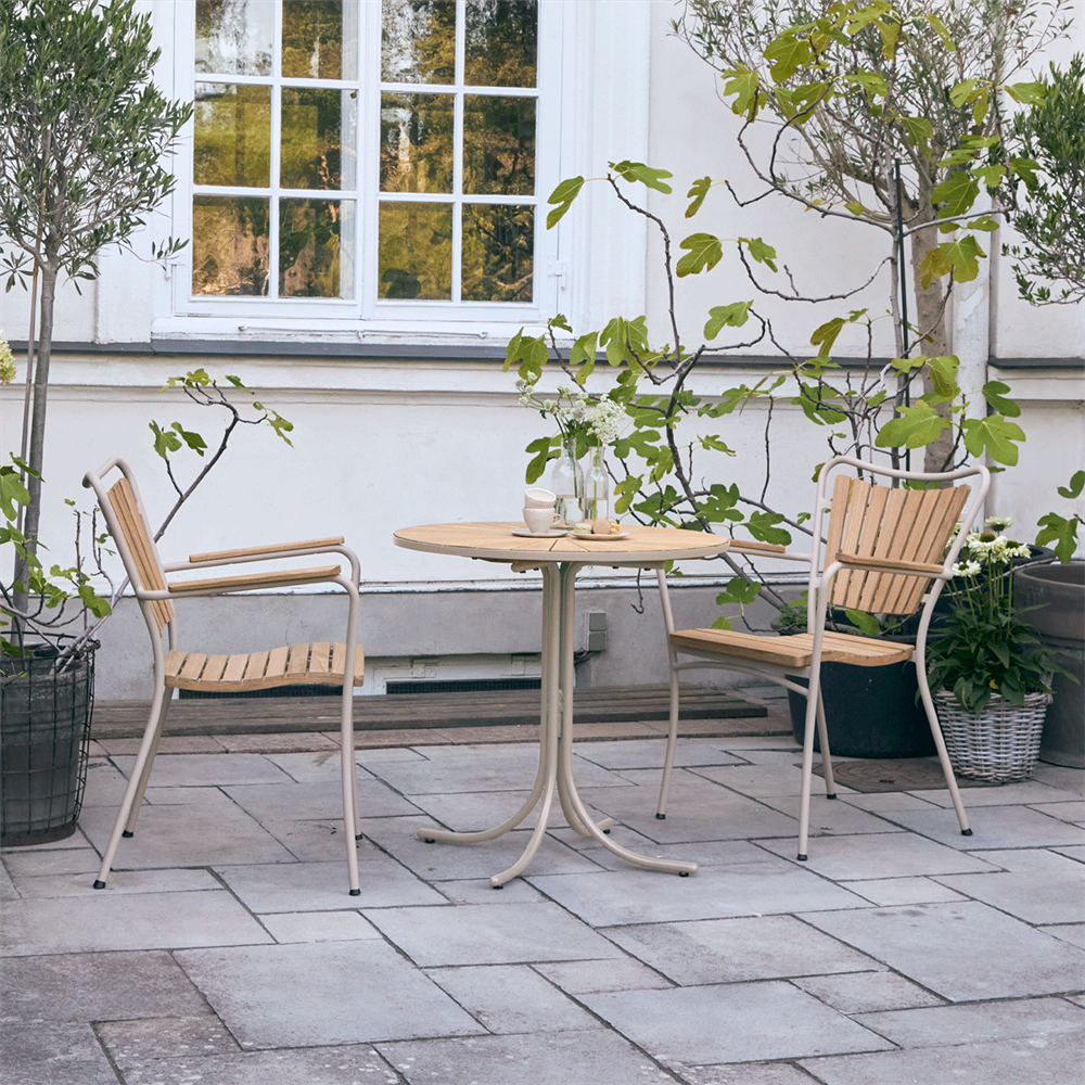 Cafébordet måler en diameter på 70 cm og har en højde på 68 cm - stadig nok til at havestolene kan gå ind under bordpladen. Bordpladen er i teak og stellet i pulverlakeret aluminium.