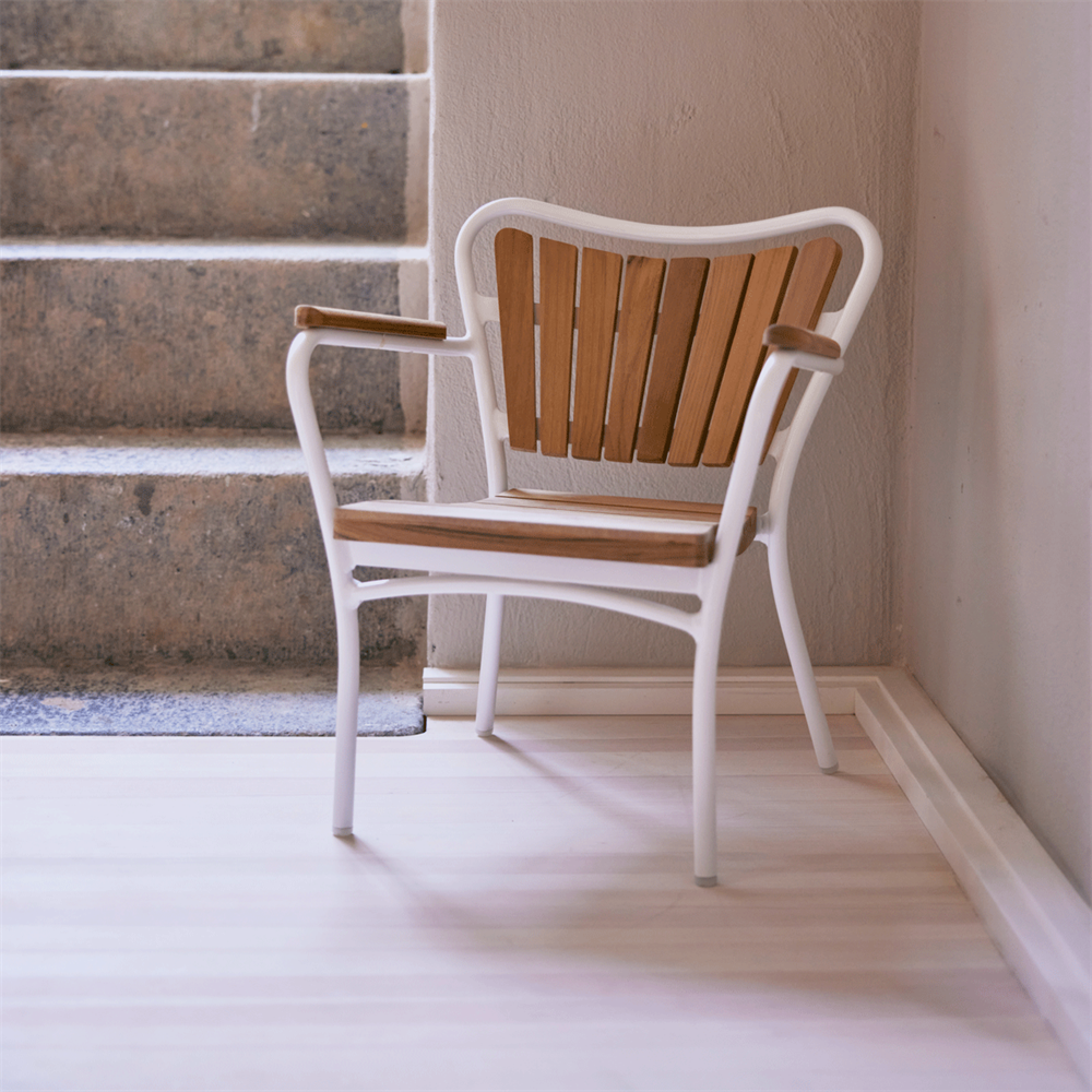 Den stabelbare Marguerit børnestol er en del af den ikoniske Marguerit-serie og designet med samme sans for æstetik og kvalitet bare i børnestørrelse. Stolen er fremstillet med sæde, ryg og armlæn i massivt teaktræ og et pulverlakeret aluminiumsstel i klassisk hvid.