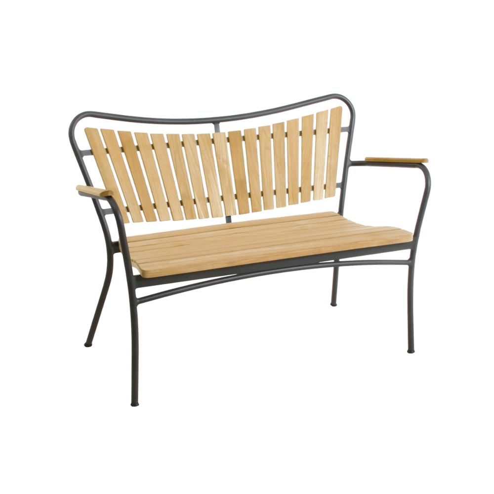 Kombinér bænken med det bådformede Marguerit havebord for et fleksibelt og harmonisk udendørsområde. Bænken har plads til to personer og fungerer både som en del af et større havesæt eller som et selvstændigt møbel i en grøn oase.