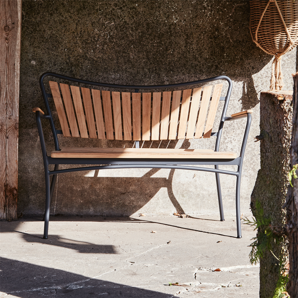 Bænken er fremstillet i bæredygtig, FSC-certificeret indonesisk teak og har et let, men solidt stel i pulverlakeret aluminium et holdbart og vejrbestandigt materialevalg, der kræver minimal vedligeholdelse. Og den er selvfølgelig stabelbar.