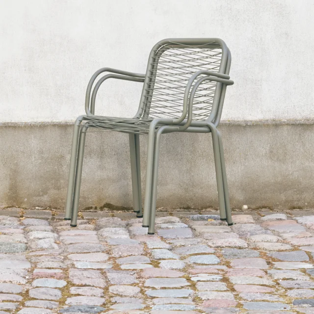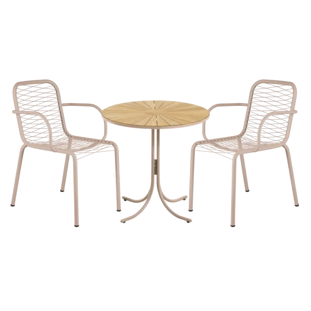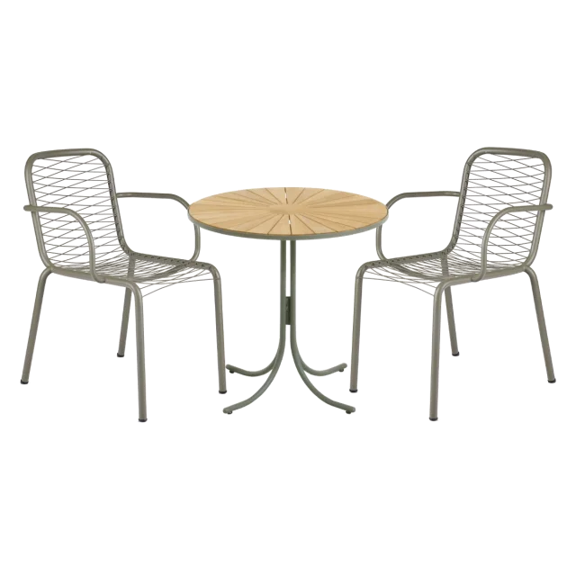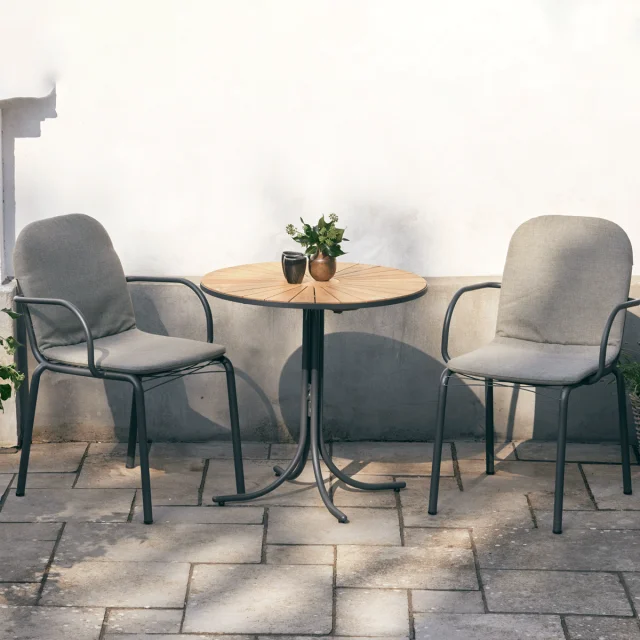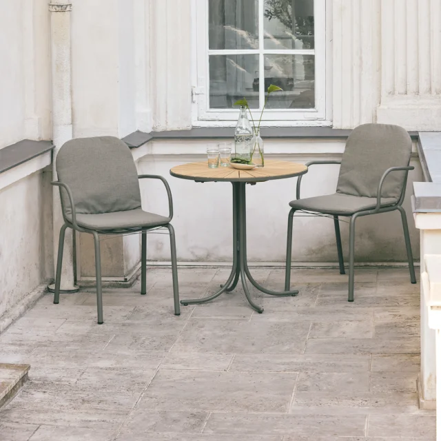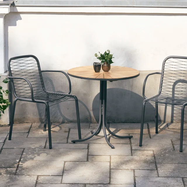 Cafésættet består af et rundt bord med en diameter på 70 cm samt Marguerit Ivy Wire‑stole, som er en moderne fortolkning af det klassiske Marguerit‑design med et let og luftigt udtryk. Kombinationen af det runde bord og den slanke stol skaber et elegant udendørs spisemiljø, der både er funktionelt og indbydende – ideelt til hyggelige måltider, kaffe med venner eller afslapning i solen.