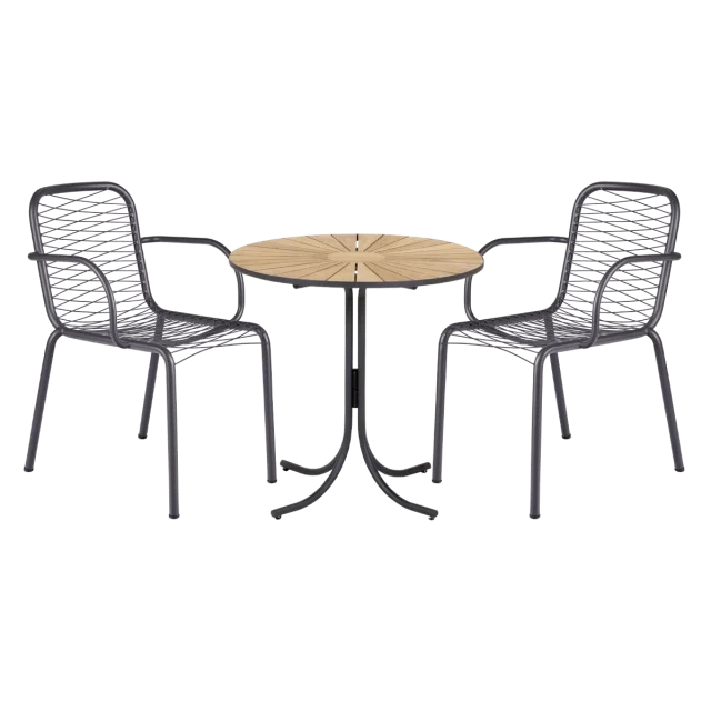 Et stilrent og funktionelt cafésæt, der kombinerer klassisk havemøbeldesign med moderne materialer til udendørs brug.