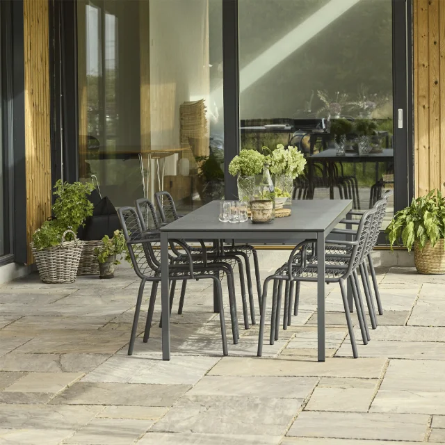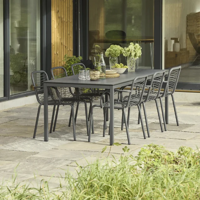 Havesættet består af et Pure havebord og fire Ivy Wire havestole, der tilsammen skaber et harmonisk og indbydende udendørs spiseområde. Bordet har en bordplade i kompaktlaminat med et flot skiffer-look, som er både ridsefast, formstabilt og modstandsdygtigt over for fugt og temperatursvingninger – ideelt til det danske klima.