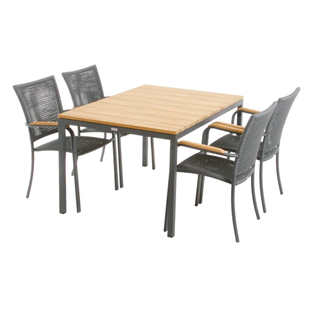 Havesættet består af et Toscano havebord og Ravello havestole, der sammen skaber et harmonisk spiseområde udendørs. Bordet har en bordplade i bæredygtig plantageteak, som tilfører varme og naturlig karakter, mens stellet i pulverlakeret aluminium sikrer stabilitet og holdbarhed i det danske klima. Kombinationen af træ og metal giver et tidløst udtryk, der passer godt til både moderne og klassiske uderum.