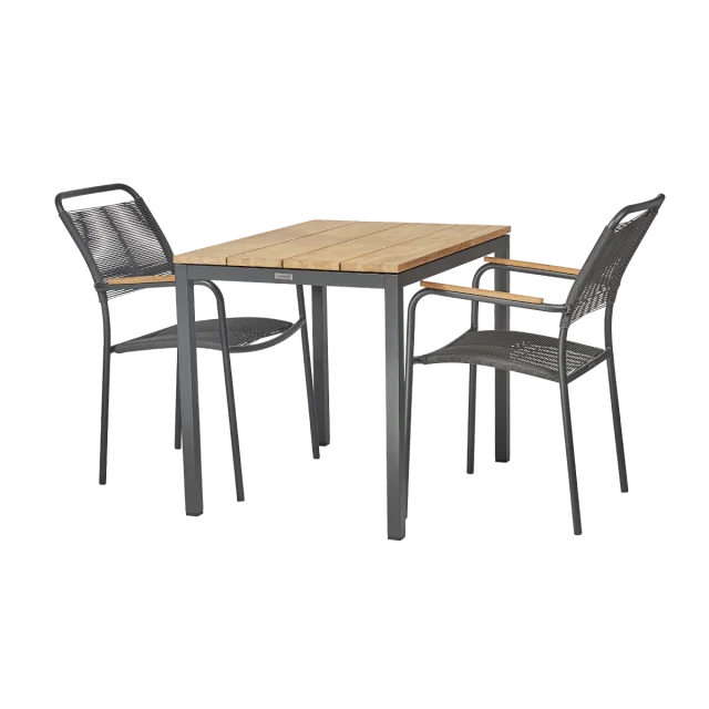 Havesættet består af et Toscana havebord og Verona havestole, der tilsammen skaber et harmonisk uderum. Bordet har en bordplade i bæredygtig plantageteak, som tilfører varme og naturlig karakter, mens stellet i pulverlakeret aluminium sikrer stabilitet og holdbarhed i det skiftende nordiske klima. Kombinationen af teak og aluminium giver et tidløst design, der passer til både moderne og klassiske omgivelser.