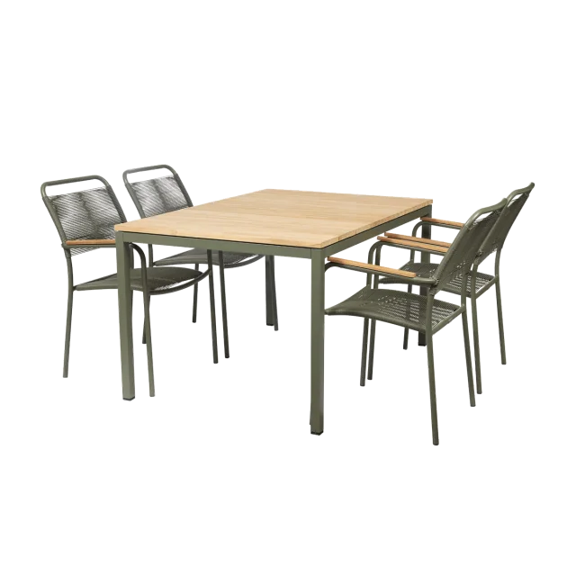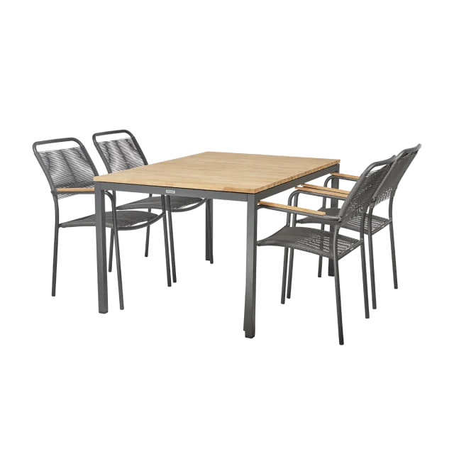 Havesættet består af et Toscana havebord og Verona havestole, der tilsammen skaber et harmonisk uderum. Bordet har en bordplade i bæredygtig plantageteak, som tilfører varme og naturlig karakter, mens stellet i pulverlakeret aluminium sikrer stabilitet og holdbarhed i det skiftende nordiske klima. Kombinationen af teak og aluminium giver et tidløst design, der passer til både moderne og klassiske omgivelser.