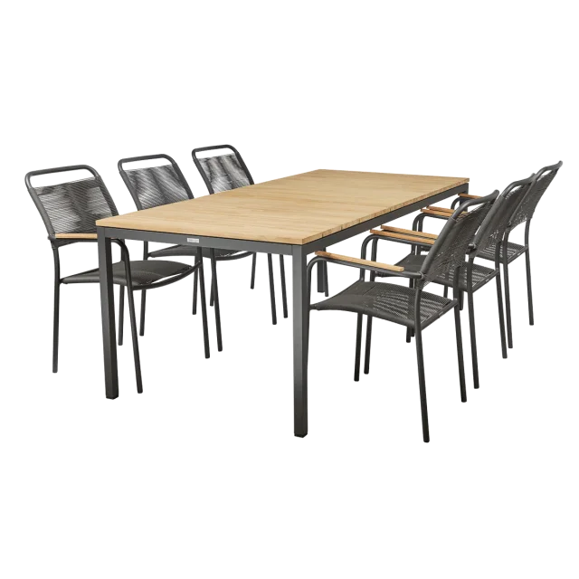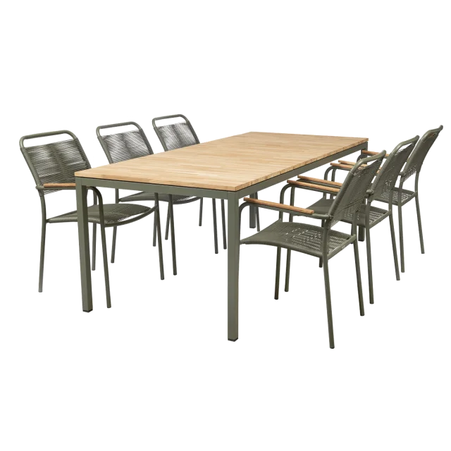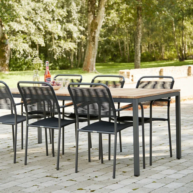Havesættet består af et Toscana havebord og Verona havestole, der tilsammen skaber et harmonisk uderum. Bordet har en bordplade i bæredygtig plantageteak, som tilfører varme og naturlig karakter, mens stellet i pulverlakeret aluminium sikrer stabilitet og holdbarhed i det skiftende nordiske klima. Kombinationen af teak og aluminium giver et tidløst design, der passer til både moderne og klassiske omgivelser.