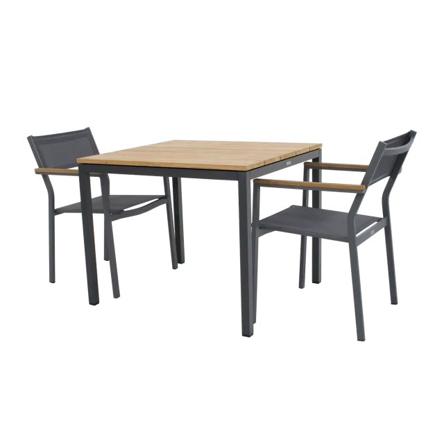 Havesættet består af et Toscano havebord og Elba havestole, der tilsammen danner et harmonisk og moderne spiseområde udendørs. Bordet har en bordplade i bæredygtig plantageteak, som tilfører varme og naturlig karakter til sættet, mens stellet i pulverlakeret aluminium sikrer robusthed og lang holdbarhed i det danske vejr. Kombinationen af teak og aluminium skaber et tidløst udtryk, der passer ind i både klassiske og moderne uderum.