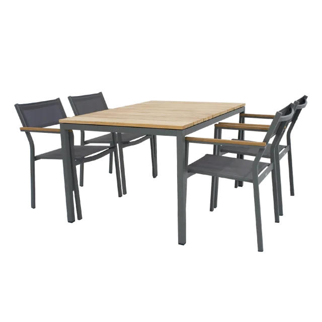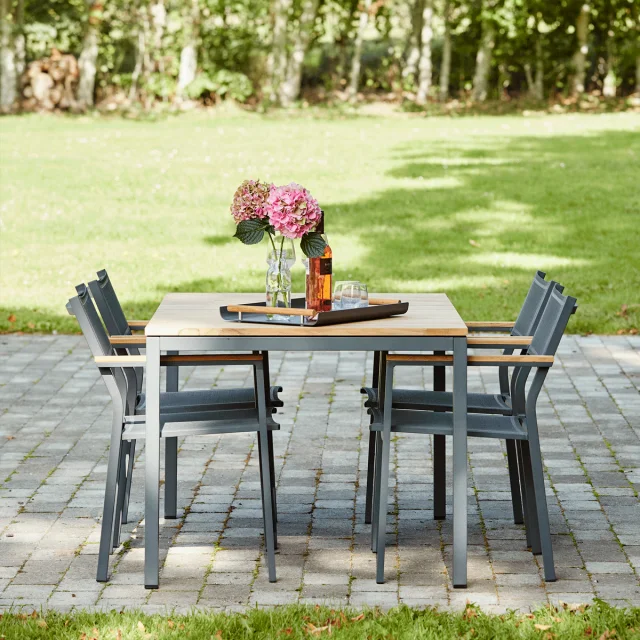 Havesættet består af et Toscano havebord og Elba havestole, der tilsammen danner et harmonisk og moderne spiseområde udendørs. Bordet har en bordplade i bæredygtig plantageteak, som tilfører varme og naturlig karakter til sættet, mens stellet i pulverlakeret aluminium sikrer robusthed og lang holdbarhed i det danske vejr. Kombinationen af teak og aluminium skaber et tidløst udtryk, der passer ind i både klassiske og moderne uderum.