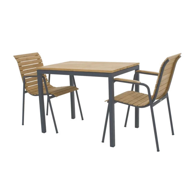 Havesættet består af et Toscana havebord og Bellevue havestole, der tilsammen skaber et harmonisk spiseområde udendørs. Bordet har en bordplade i bæredygtig plantageteak, som tilfører varme og naturlig karakter, mens stellet i pulverlakeret aluminium sikrer en robust og langtidsholdbar konstruktion. Kombinationen af træ og metal giver et tidløst og moderne udtryk, der passer til mange typer udeindretning.