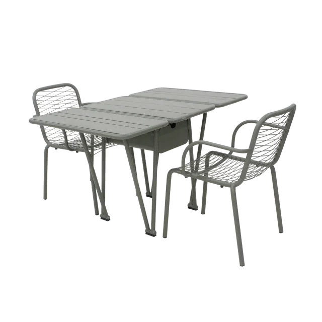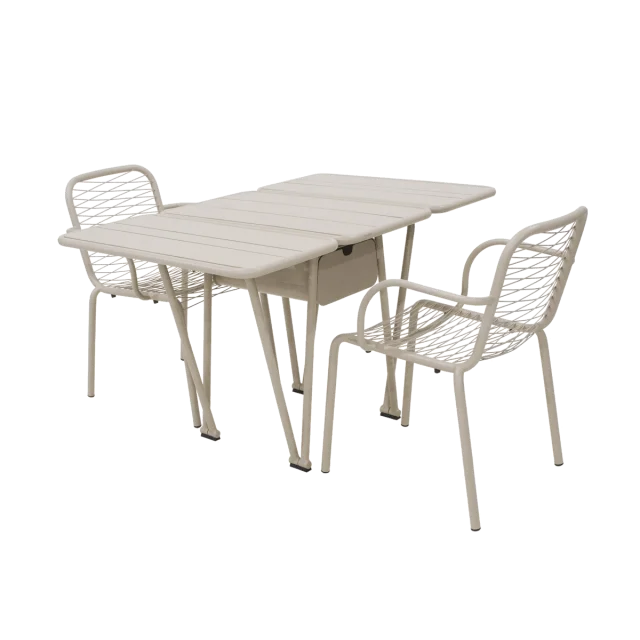 Havesættet består af et Ivy klapbord og to Ivy Wire havestole. Bordet er designet med et smart rotationsled i fødderne, så det nemt kan foldes ud efter behov. Bordets størrelse kan justeres, så der er plads til flere personer, og det er samtidig udstyret med en praktisk udtræksskuffe, hvor småting til borddækningen kan opbevares tæt ved hånden.
