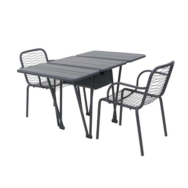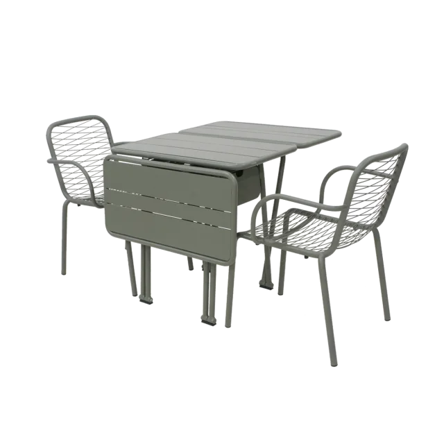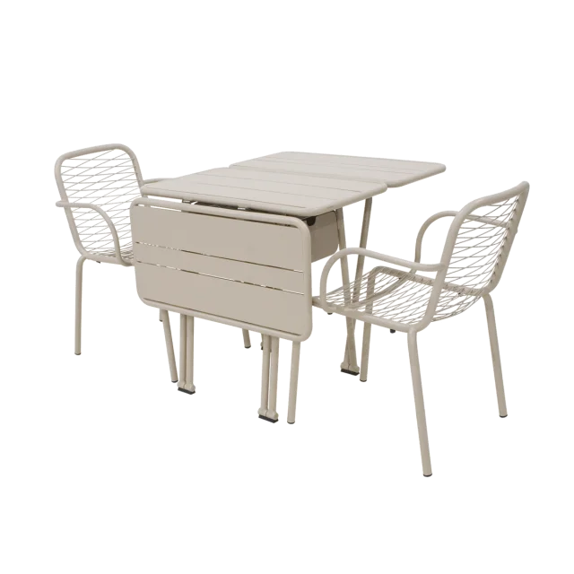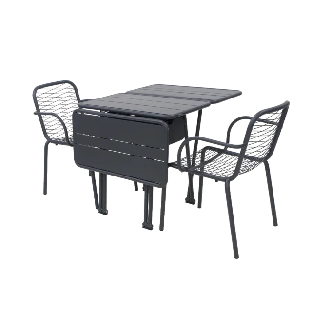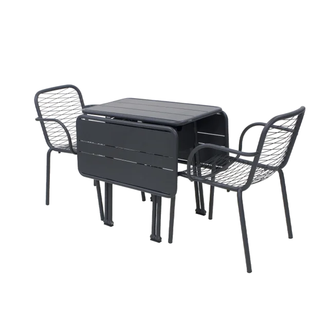 Et fleksibelt og stilrent havemøbelsæt, der er ideelt til altaner og små terrasser, hvor pladsen skal udnyttes optimalt.