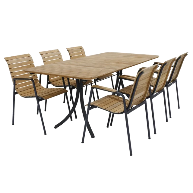 Havesættet består af et Magnolia havebord og Bellevue havestole, som tilsammen udgør et harmonisk spiseområde. Bordet har en bordplade i bæredygtig plantageteak, som tilfører varme og naturlig karakter, mens stellet i pulverlakeret aluminium sikrer høj stabilitet og lang holdbarhed. Kombinationen af træ og metal giver et tidløst udtryk, der passer ind i både klassiske og moderne udeområder.