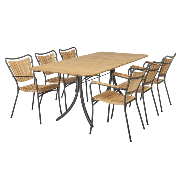 Havesættet består af et Magnolia havebord og Marguerit havestole, som tilsammen udgør et harmonisk spiseområde. Bordet har en bordplade i bæredygtig plantageteak, som tilfører varme og naturlig karakter, mens stellet i pulverlakeret aluminium sikrer høj stabilitet og lang holdbarhed. Kombinationen af træ og metal giver et tidløst udtryk, der passer ind i både klassiske og moderne udeområder.
