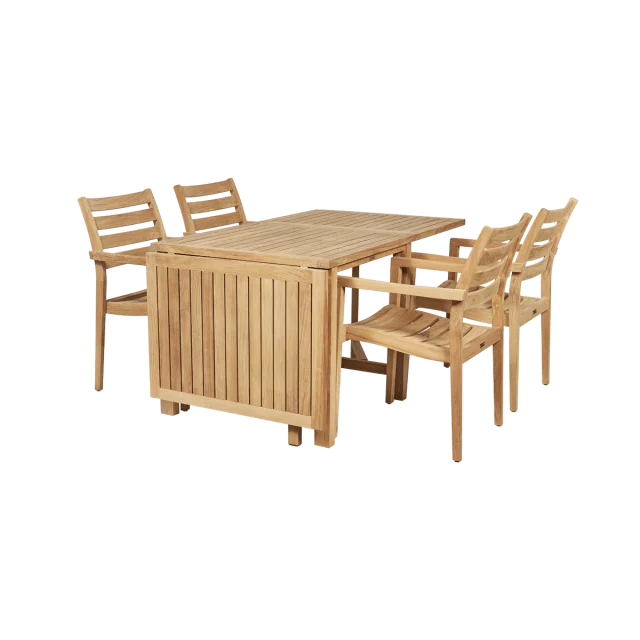 Det naturlige teaktræ bidrager til et tidløst look, som nemt kan kombineres med andre havemøbler og accessories i uderummet. Samtidig sikrer træets kvalitet, at sættet kan holde i mange år med den rette pleje.