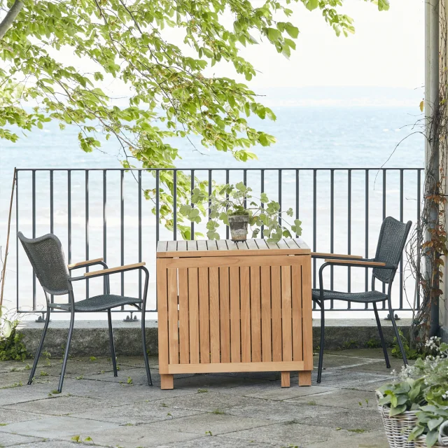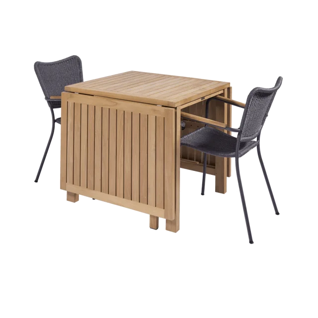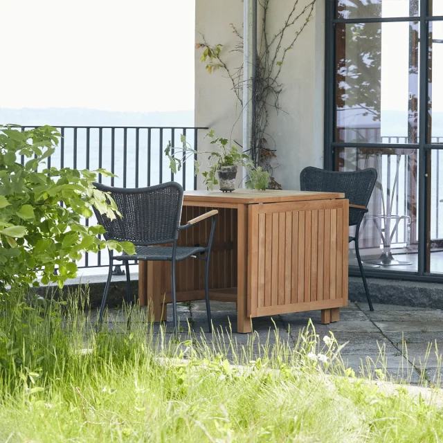 Havesættet består af et Cambridge klapbord i massivt plantageteak samt Bellevue havestole med teakdetaljer og stel i pulverlakeret aluminium. Teaktræet tilfører varme og naturlig karakter til designet, mens aluminiumstellet sikrer stabilitet og høj holdbarhed i det skiftende danske vejr.