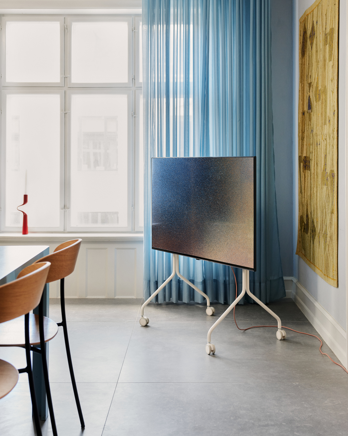 Moon Rollin’ fra Pedestal kombinerer design og fleksibilitet med sit minimalistiske look og bevægelige hjul, så TV’et let kan rulles rundt. Konstruktionen er solid, med fokus på stabilitet og æstetik.
