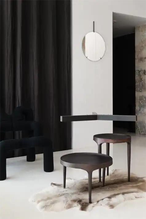 Karakteriseret af sit tilsigtede naive og håndlavede udtryk og rå, upolerede overflade, afslører Phantom-bordet sin unikke støbeteknik. Serien er på én gang skrøbelig, delikat og omfangsrig i sit udseende. Phantom sofabordene fås i en høj og en lav udgave lavet af støbt aluminium og håndmalet i en smukt brændt antik farve, der giver bordene et sofistikeret og subtilt udtryk.