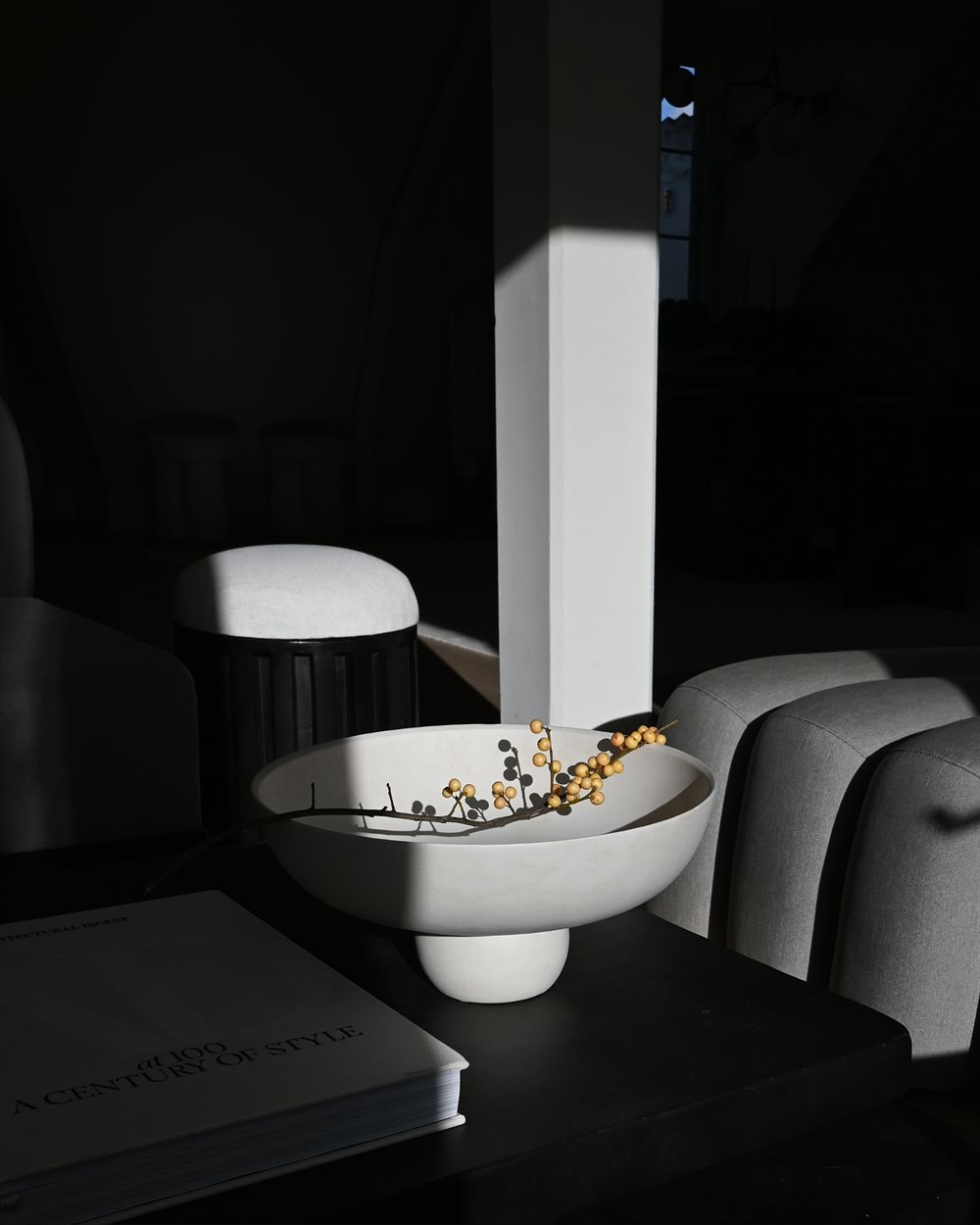 Babaru Bowl balancerer oven på en lille boble og er en skulpturel version af et traditionelt japansk skåldesign. Baburu, det japanske navn for boble, kommer i tre forskellige størrelser og kan både bruges til opbevaring eller stå alene som et kunstnerisk objekt for at løfte et rum. Serien er lavet i keramik, da det er et håndglaseret naturprodukt, farverne kan variere lidt og selvom den ikke er 100% vandtæt, medfølger en taske til friske blomster. Serien fås i tre elegante farver: Bone White, Black og Birch.