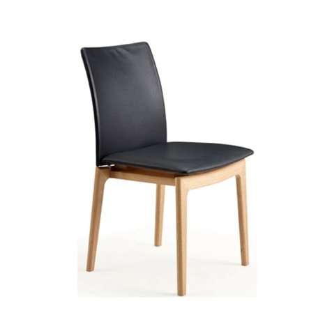 Ryggen har en letbuet form, mens sædet nærmest svæver over det flotte stel. Det gør stolen ekstra smuk og behagelig at kigge på.