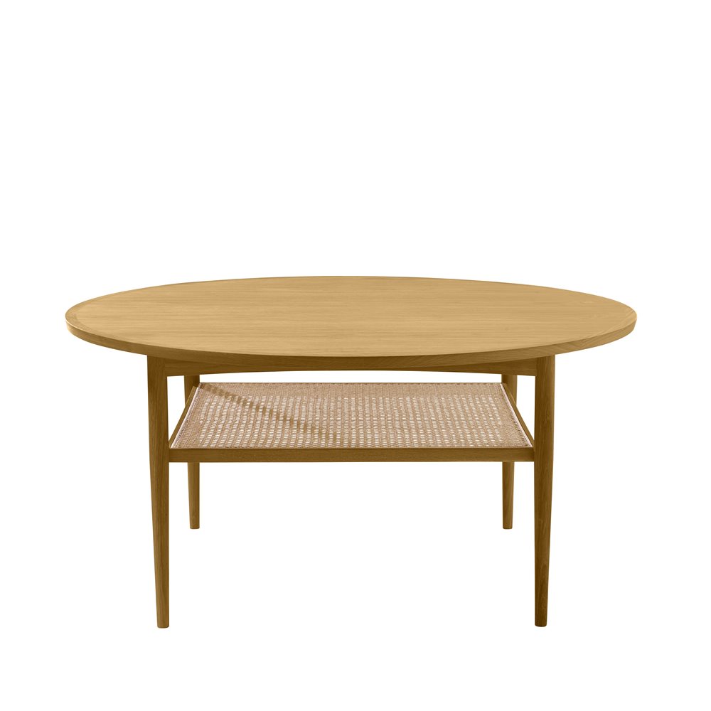 Den runde bordplade og den kvadratiske magasinhylde i fransk flet, bindes sammen af bordets øvrige detaljer, såsom den bløde bue fra sargen. No.100 er et typisk udspring af Jørgen Aakjær Jørgensens design-DNA, hvor der bliver leget med kontrasterne og kredset om detaljerne, men hvor enkelhed og funktionalitet er de dominerende parametre for det endelige resultat.