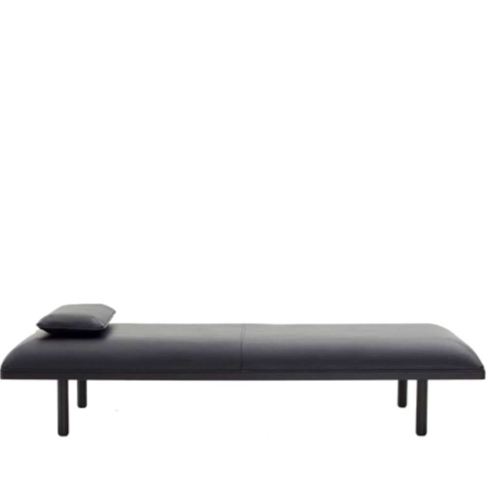 Daybeden kommer i to modeller begge i egetræ: Sort lakeret stel med sort læder eller hvidpigmenteret lak med cognaclæder. (Billedet viser DB 1 med pude, som ikke er inklusiv.)