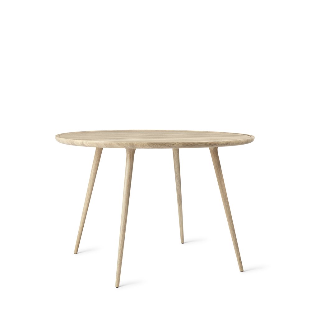 Accent spisebord Ø110 i hvidlakeret eg er et smukt og funktionelt spisebord designet af den danske designduo Space Copenhagen og produceret af Mater.