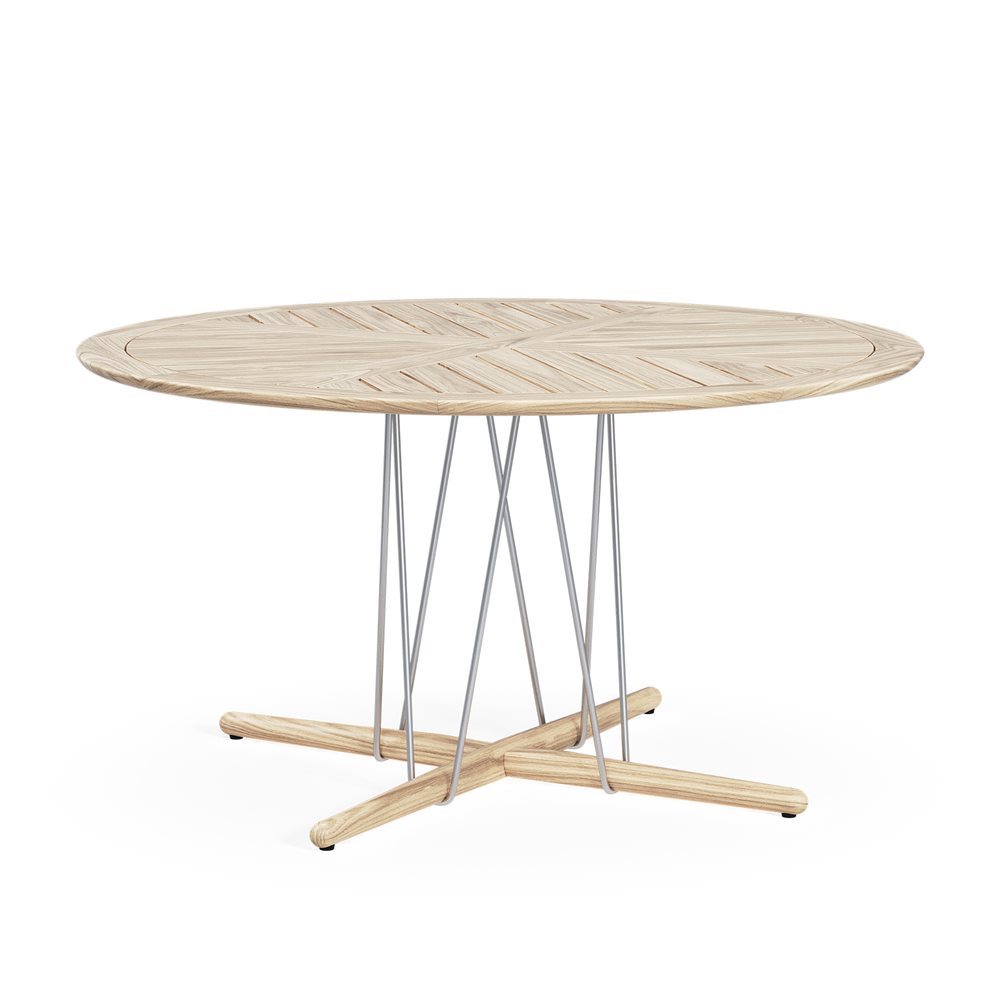 Bordet er omhyggeligt fremstillet i massiv FSC-certificeret teak og bordets elegante runde bordplade i teak hviler på en raffineret wirestruktur i stål.