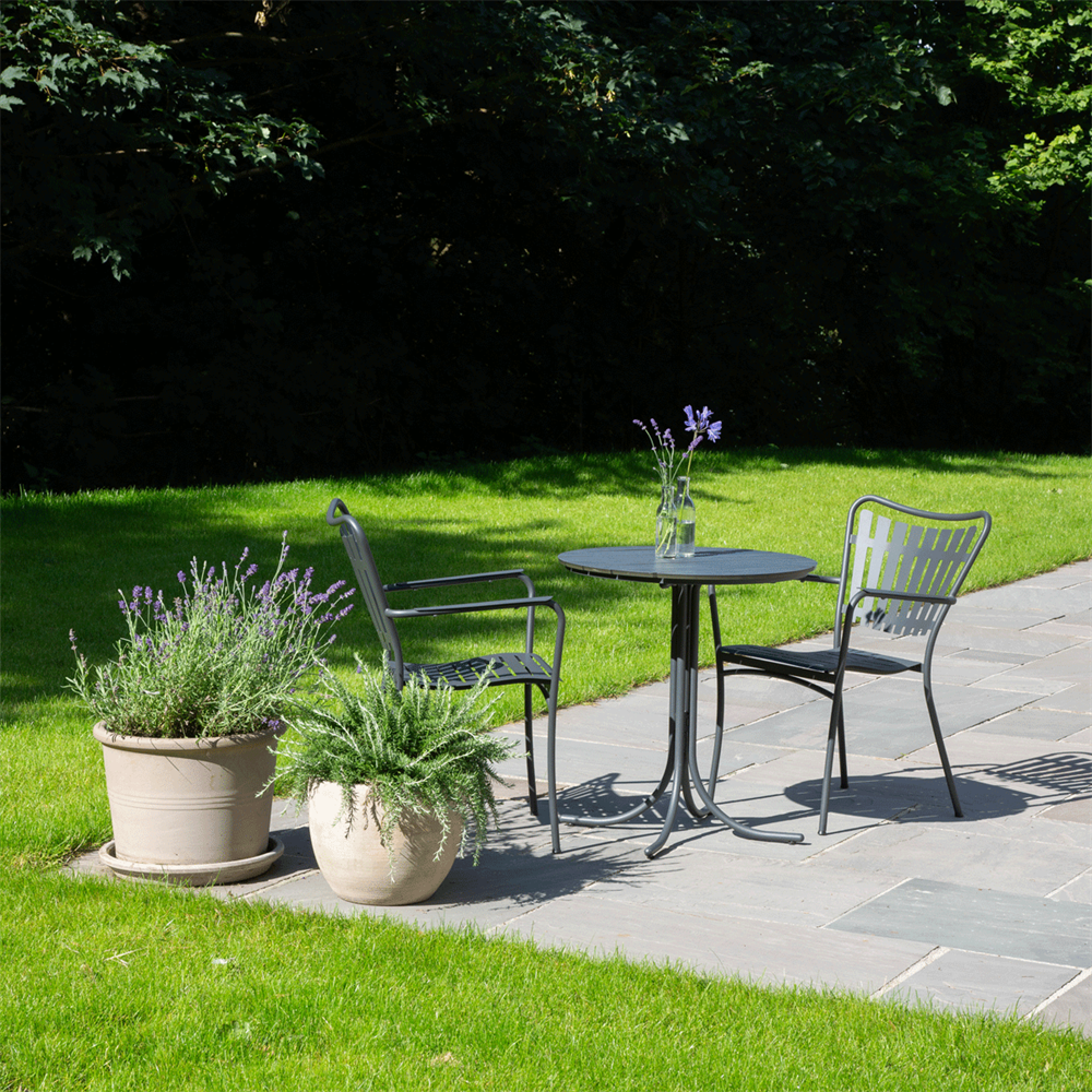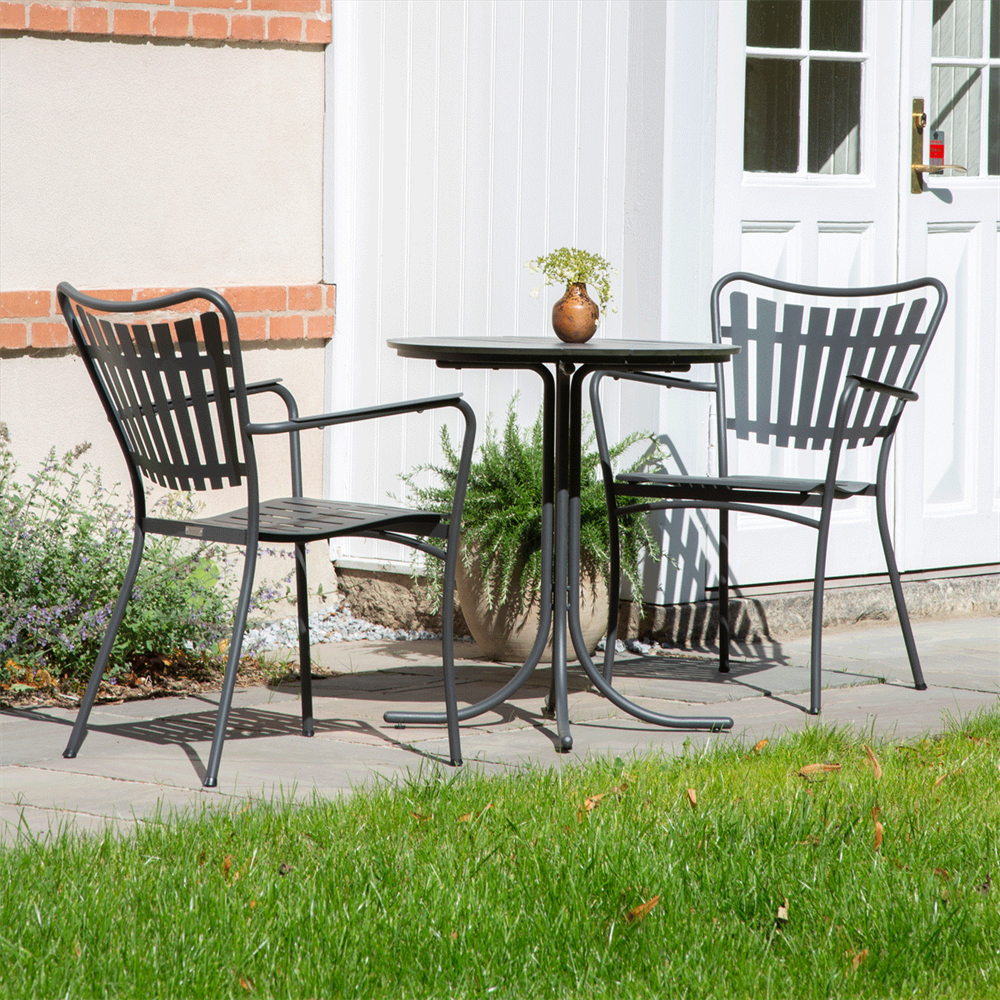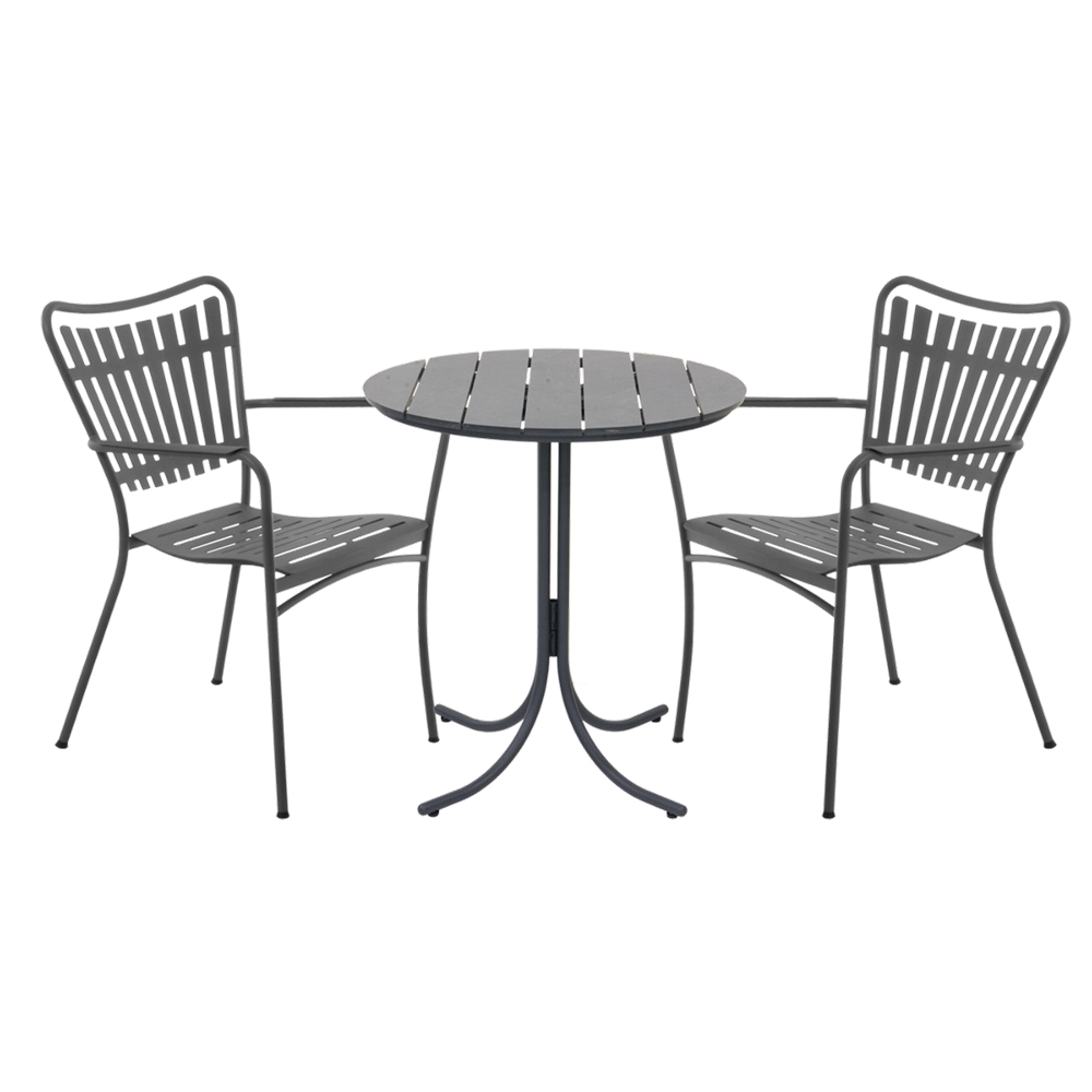 Pure cafésættet er ideelt til altanen, balkonen eller en hyggelig afkrog i haven. Bordet er udstyret med en praktisk bordplade i kompaktlaminat et ekstremt slidstærkt og formstabilt materiale, der tåler både regn, sol og frost uden problemer.