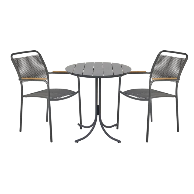 Mandalay Pure & Verona Teak cafésæt Ø67 i antracit er et elegant og funktionelt havemøbelsæt, hvor klassisk design møder moderne, vedligeholdelsesvenlige materialer. Sættet er skabt til mindre uderum som altaner, terrasser eller en hyggelig krog i haven, hvor du ønsker et stilrent og komfortabelt sted at nyde morgenkaffen eller et let måltid.