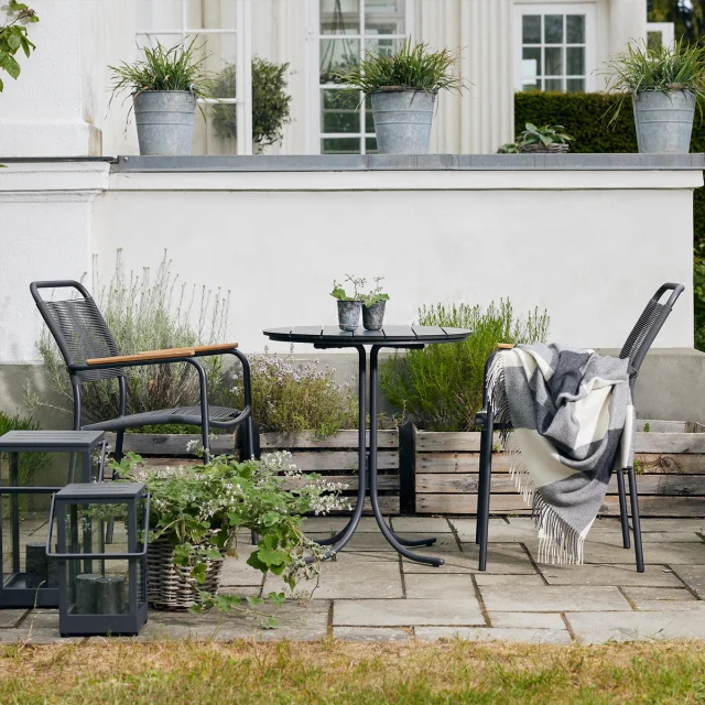 Cafésættet består af et Pure cafébord med en diameter på 67 cm samt to Verona havestole med teak-armlæn. Bordet har en bordplade i kompaktlaminat, som er både formstabilt og modstandsdygtigt over for vejr og vind, hvilket gør det ideelt til det skandinaviske klima. Samtidig er overfladen nem at rengøre og kræver minimal vedligeholdelse.