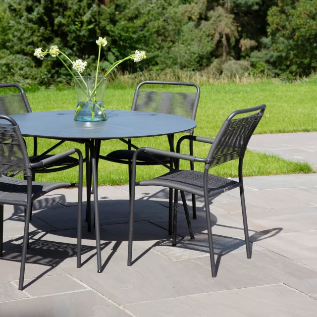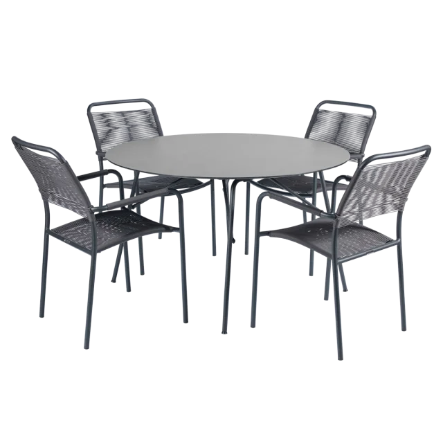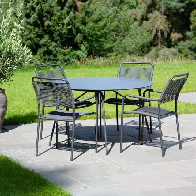 Havesættet består af et rundt Pure havebord med en diameter på 120 cm samt fire Verona SunLoom havestole. Bordet er inspireret af det klassiske Marguerit foldebord og har et enkelt og minimalistisk formsprog. Bordpladen er fremstillet i slidstærkt kompaktlaminat med skiffer-look, som er formstabilt, ridsefast og modstandsdygtigt over for vand, olie, frost og temperaturudsving – ideelt til det skandinaviske klima.