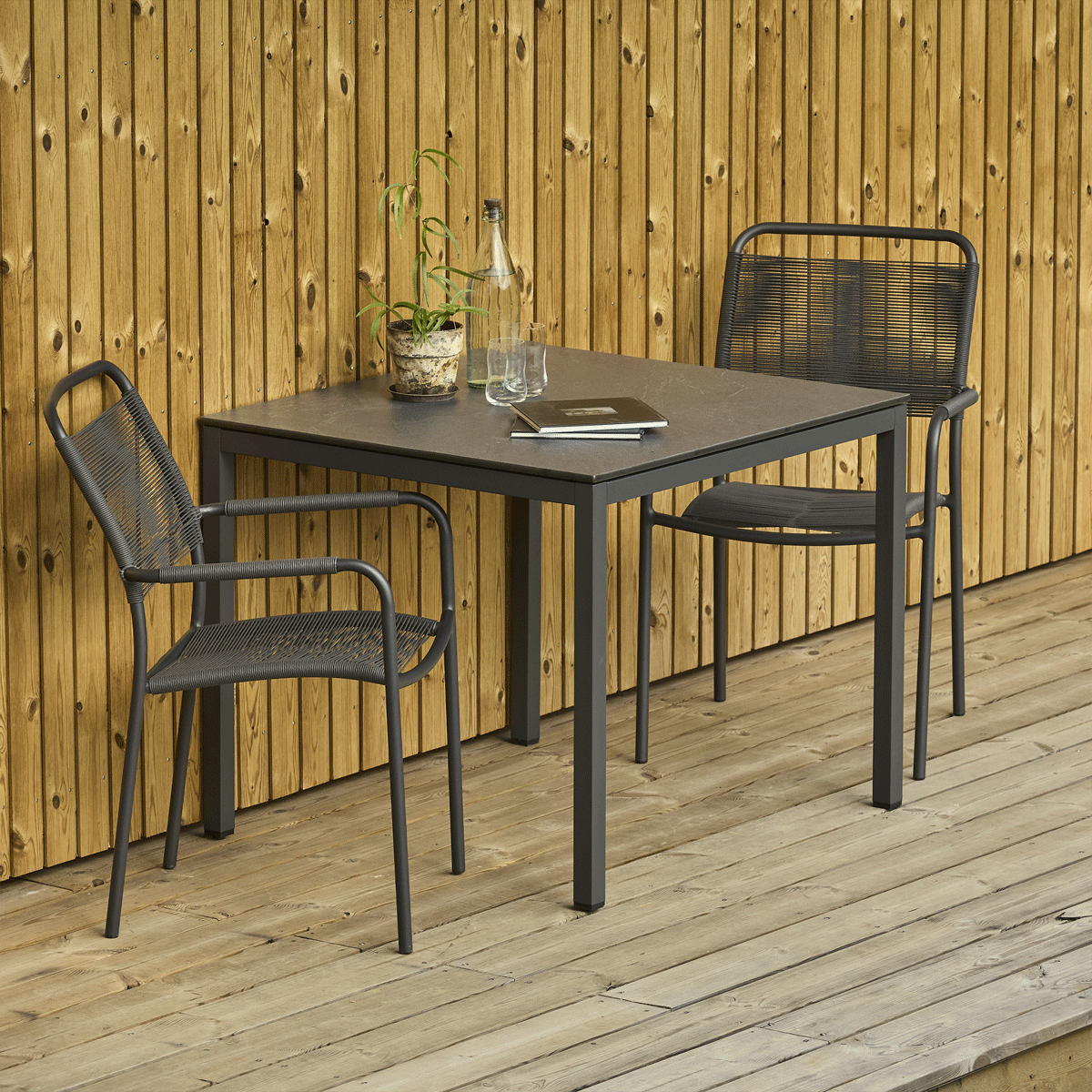 Havesættet består af et Pure havebord samt to Verona havestole og er ideelt til den mindre terrasse, altan eller et hyggeligt hjørne i haven. Bordet har et let og minimalistisk udtryk med bordplade i kompaktlaminat med skiffer-look, som er både slidstærkt, ridsefast og modstandsdygtigt over for vand, olie, frost og temperaturudsving. Stellet er fremstillet i pulverlakeret aluminium, der giver en stabil og vejrbestandig konstruktion.